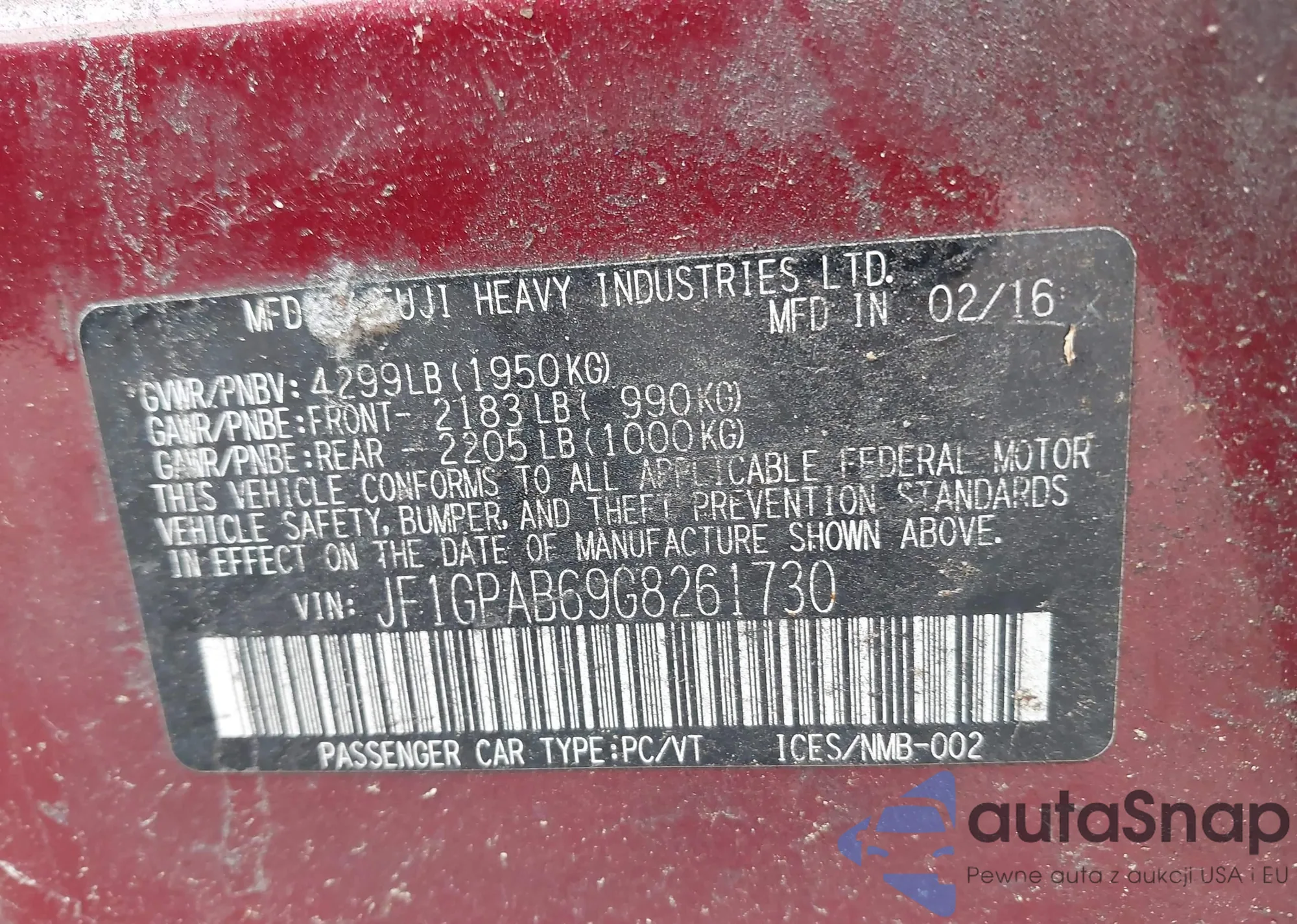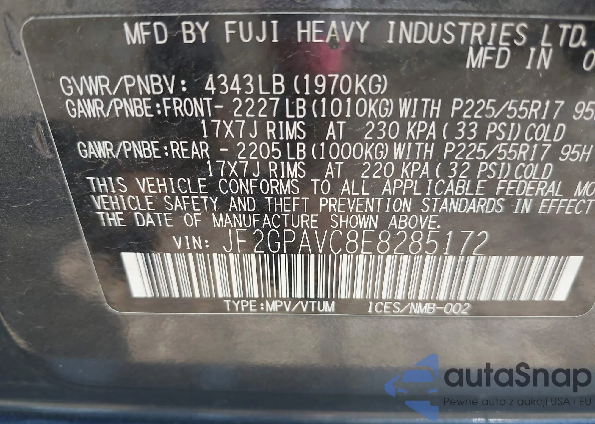 LOT: 42221167 VIN: JF2GPAVC8E8285172