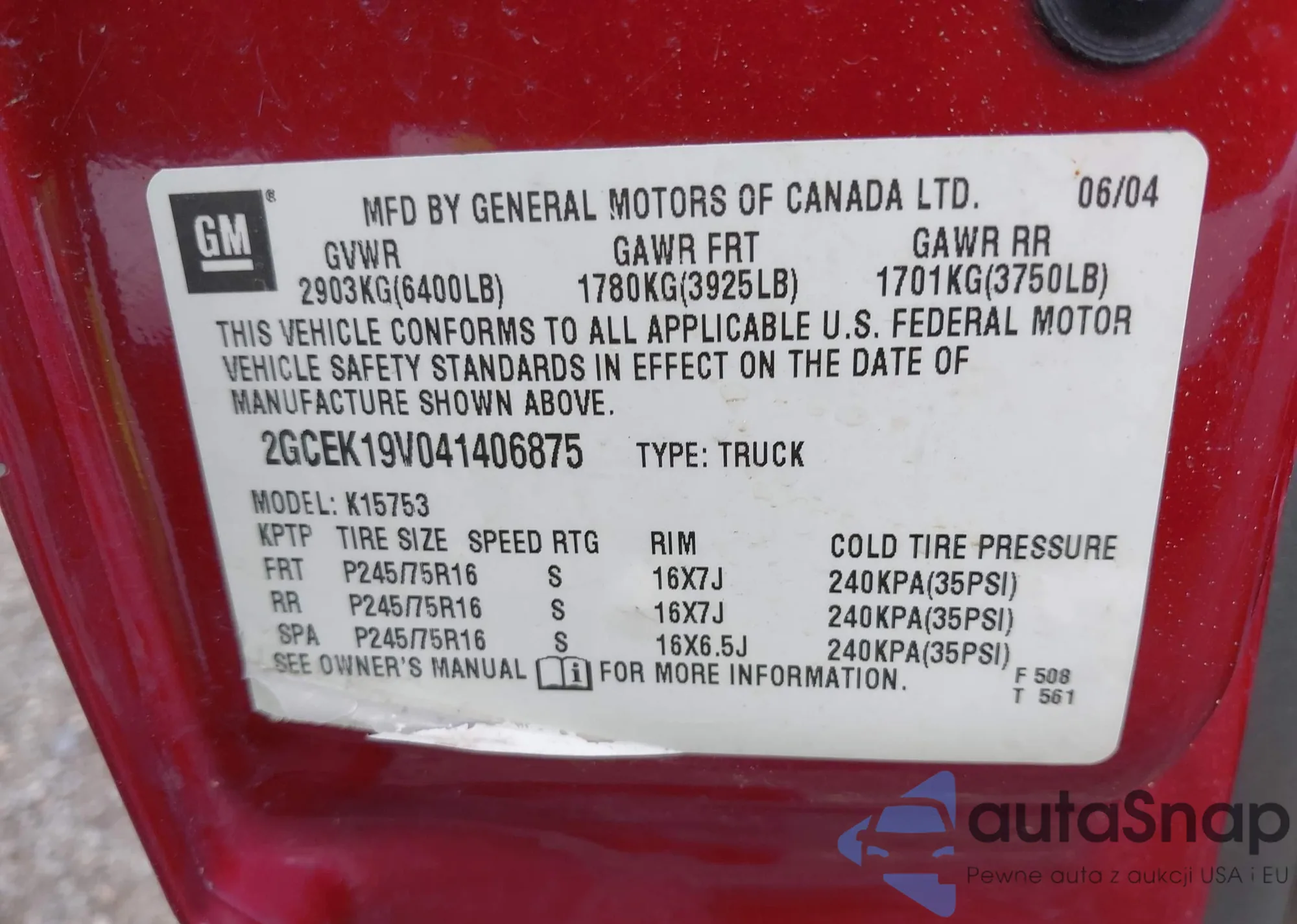• VIN 2GCEK19V041406875