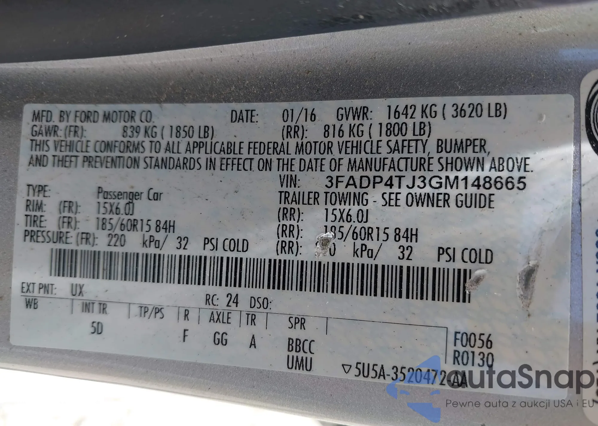 LOT: 42504276 VIN: 3FADP4TJ3GM148665