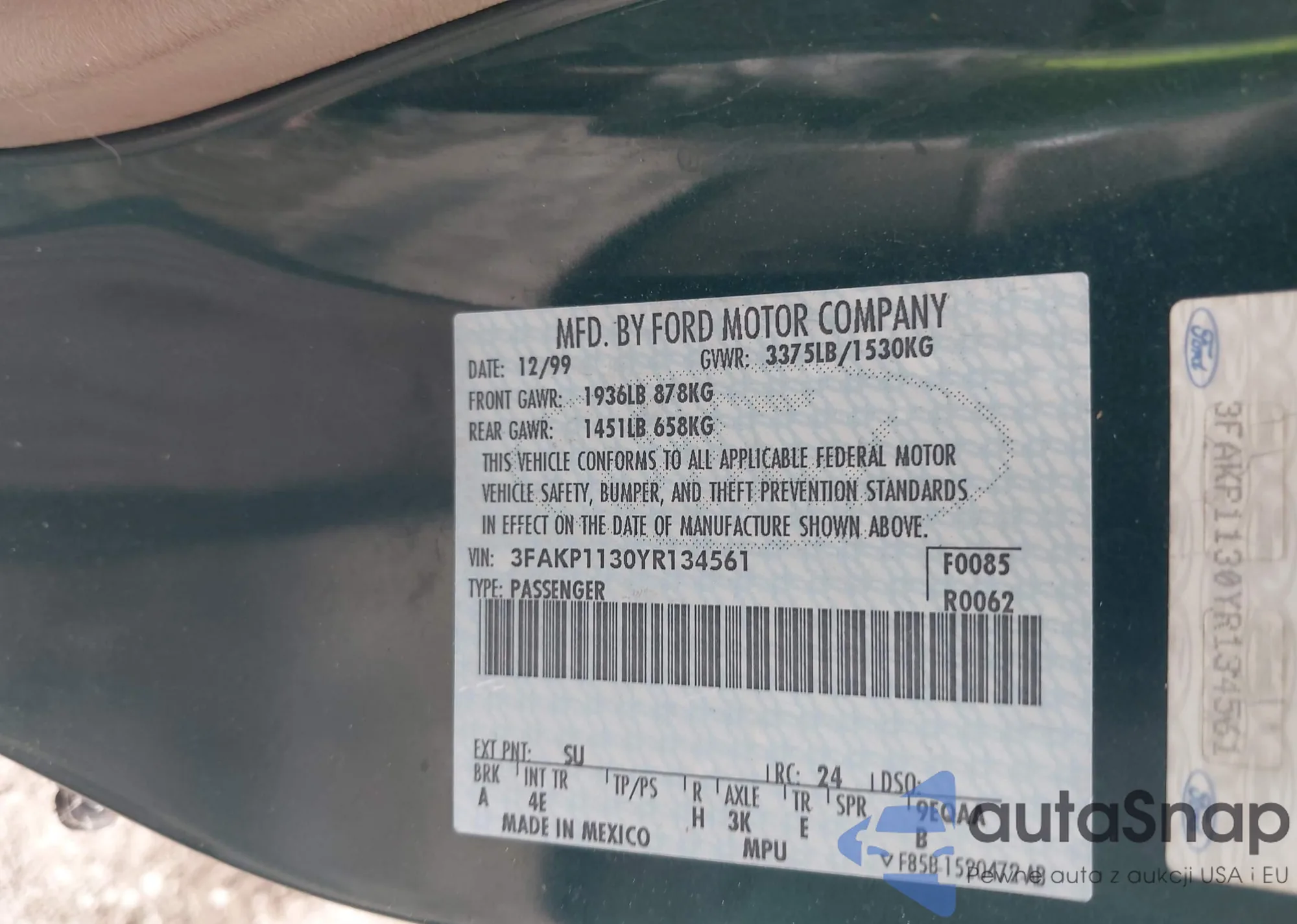 LOT: 42633016 VIN: 3FAKP1130YR134561
