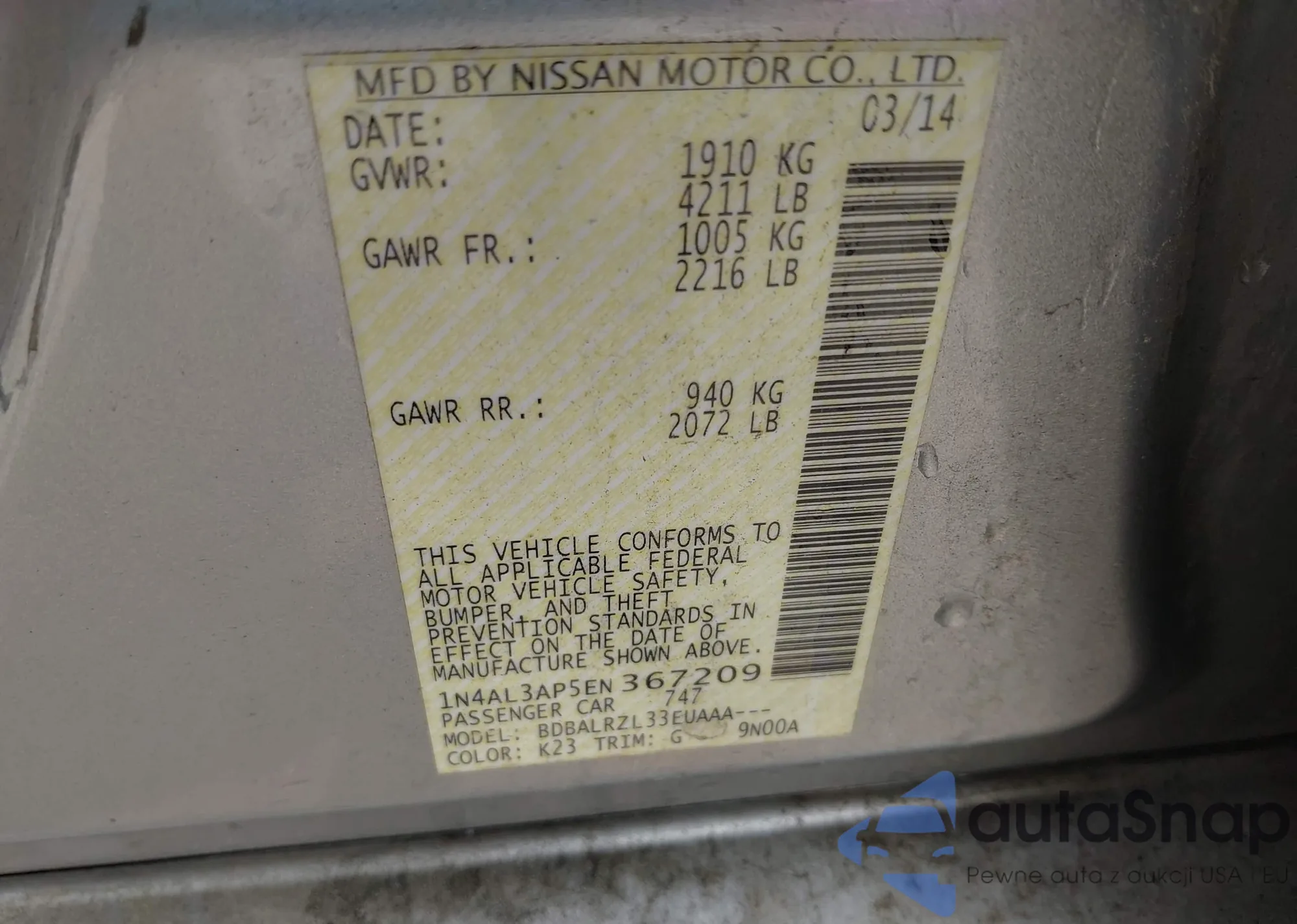 LOT: 42410219 VIN: 1N4AL3AP5EN367209