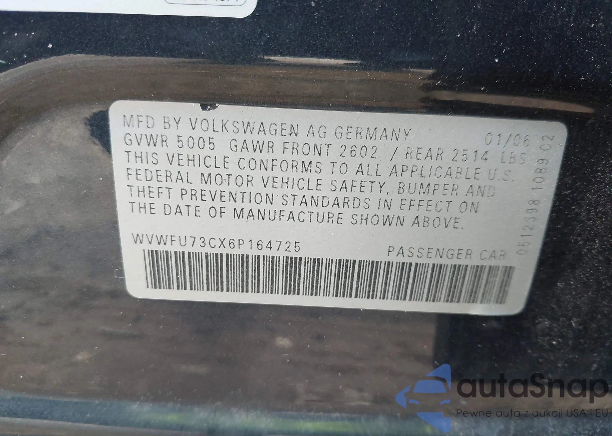 LOT: 42255126 VIN: WVWFU73CX6P164725