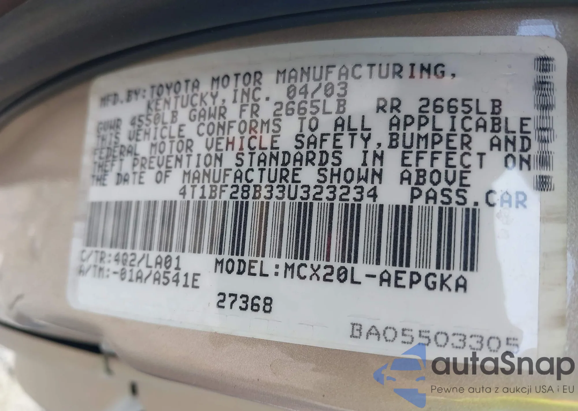 LOT: 42123216 VIN: 5TETU62N27Z404652