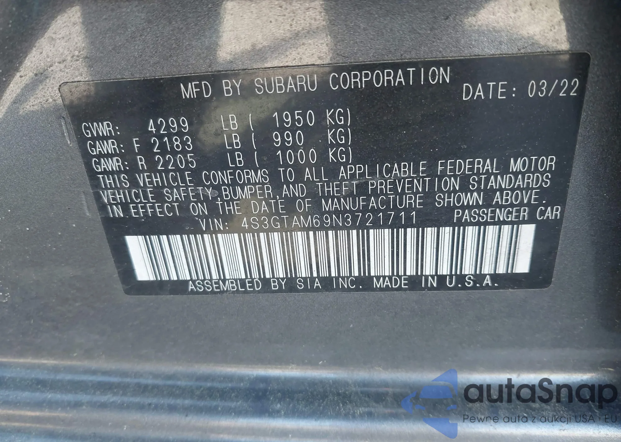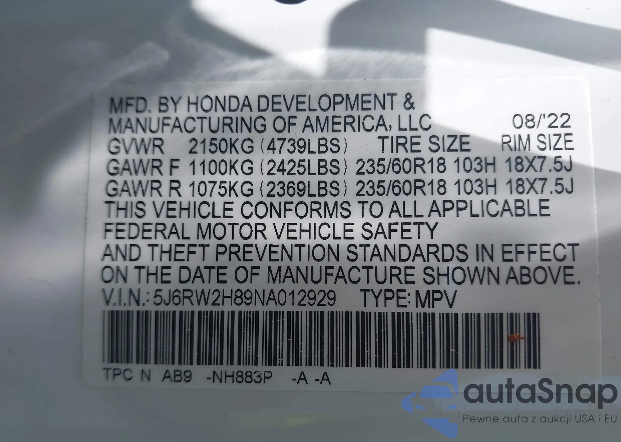 LOT: 42648847 VIN: 5YFEPMAE6NP331603