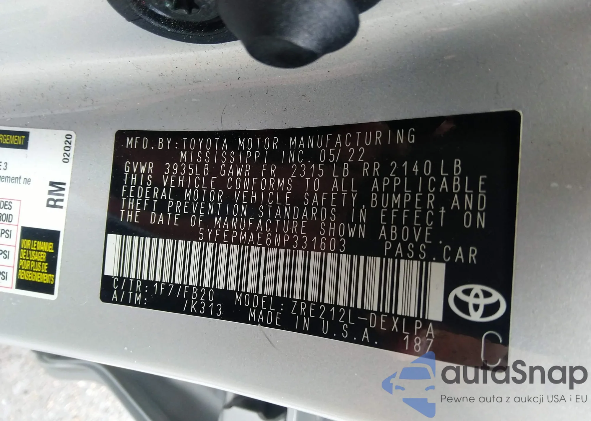 • VIN 5YFEPMAE6NP331603
