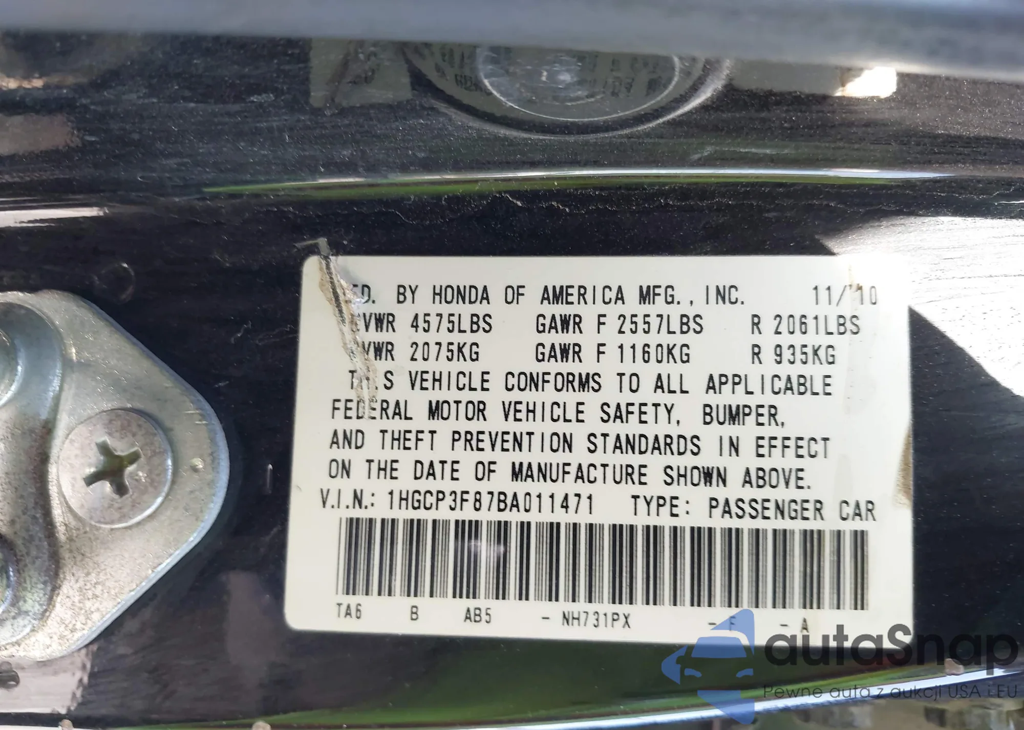 LOT: 42490188 VIN: 1HGCP3F87BA011471