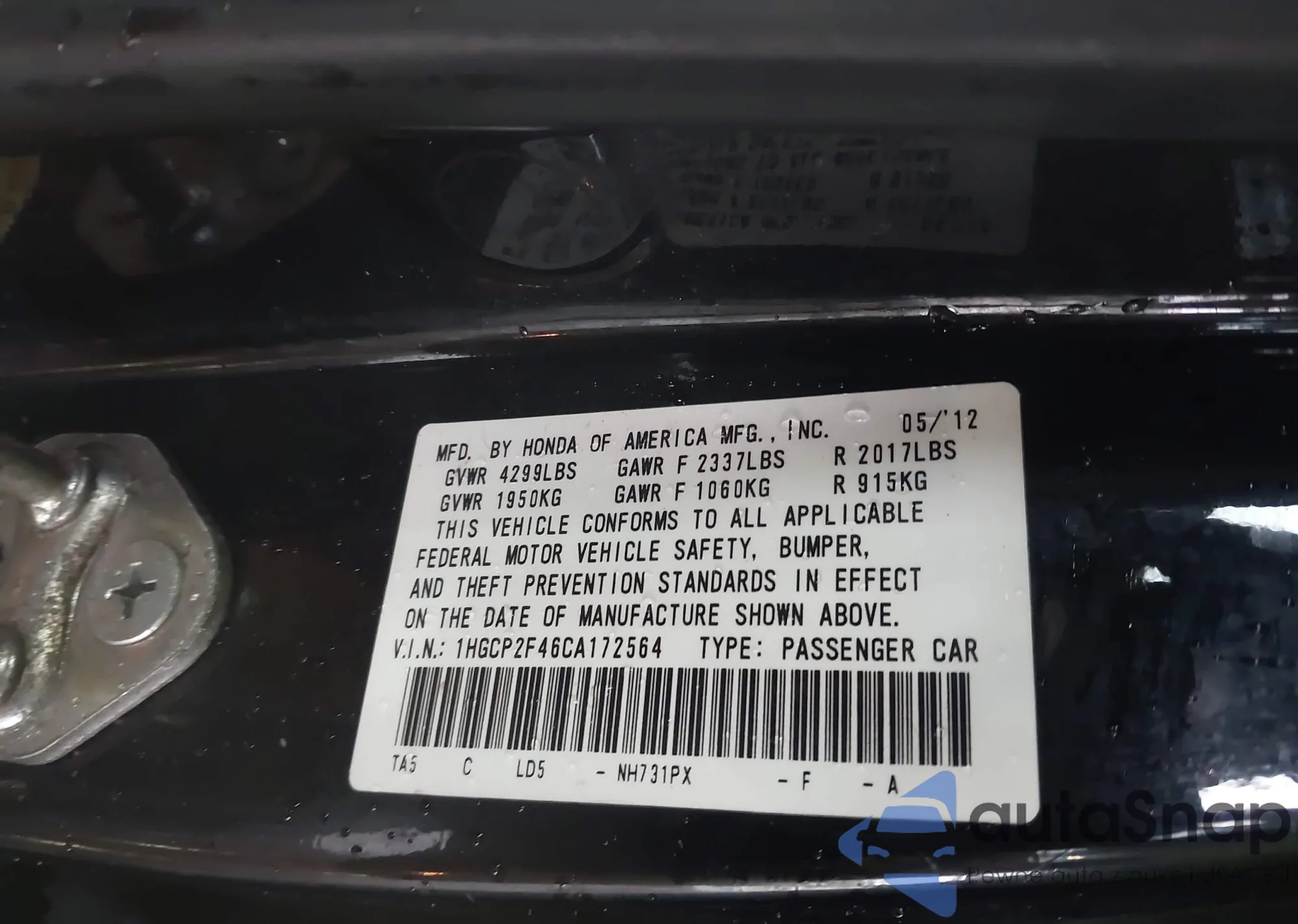 • VIN 1HGCP2F46CA172564