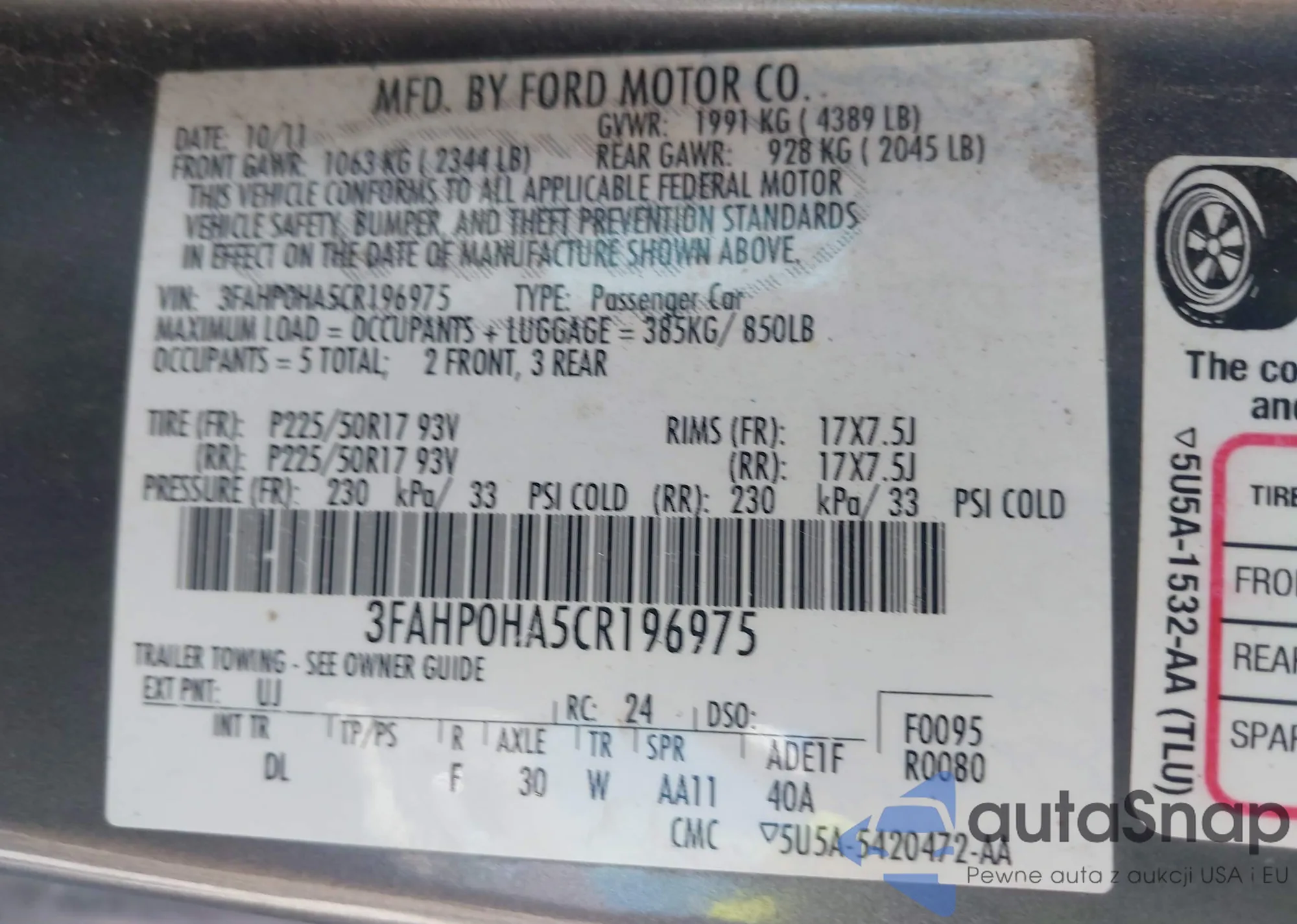 LOT: 42607026 VIN: 3FAHP0HA5CR196975