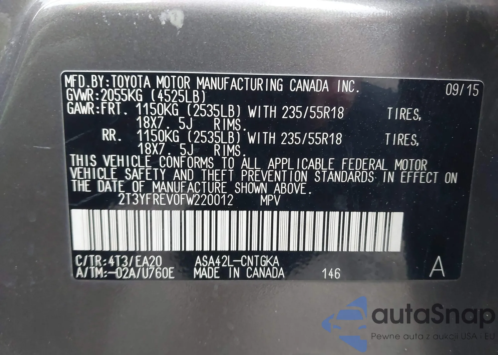 LOT: 42348478 VIN: 2T3YFREV0FW220012