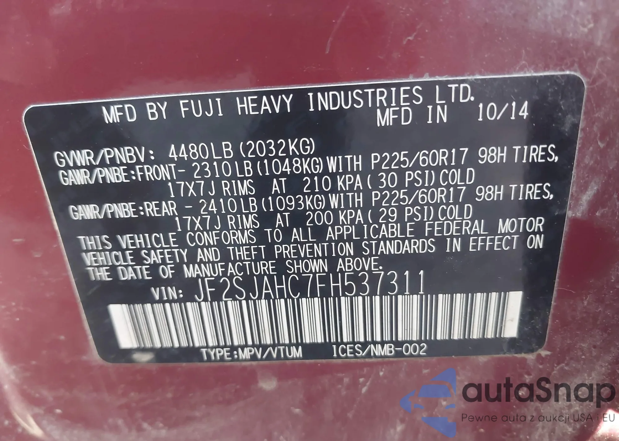 • VIN JF2SJAHC7FH537311