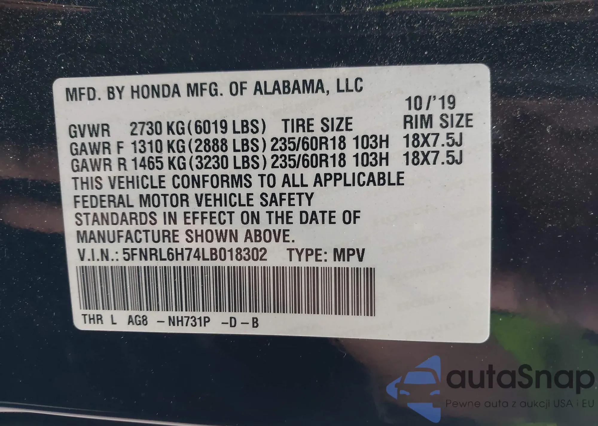 • VIN 5FNRL6H74LB018302