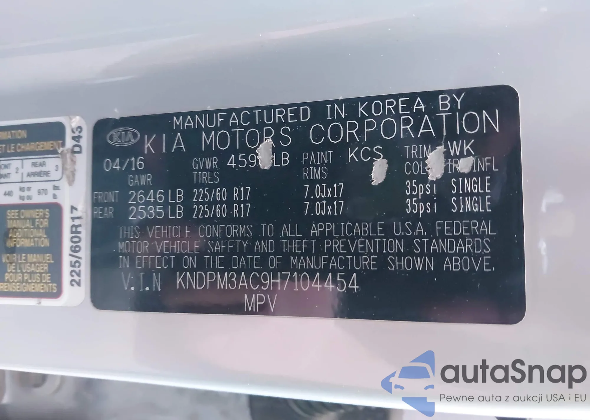 LOT: 42544204 VIN: KNDPM3AC9H7104454