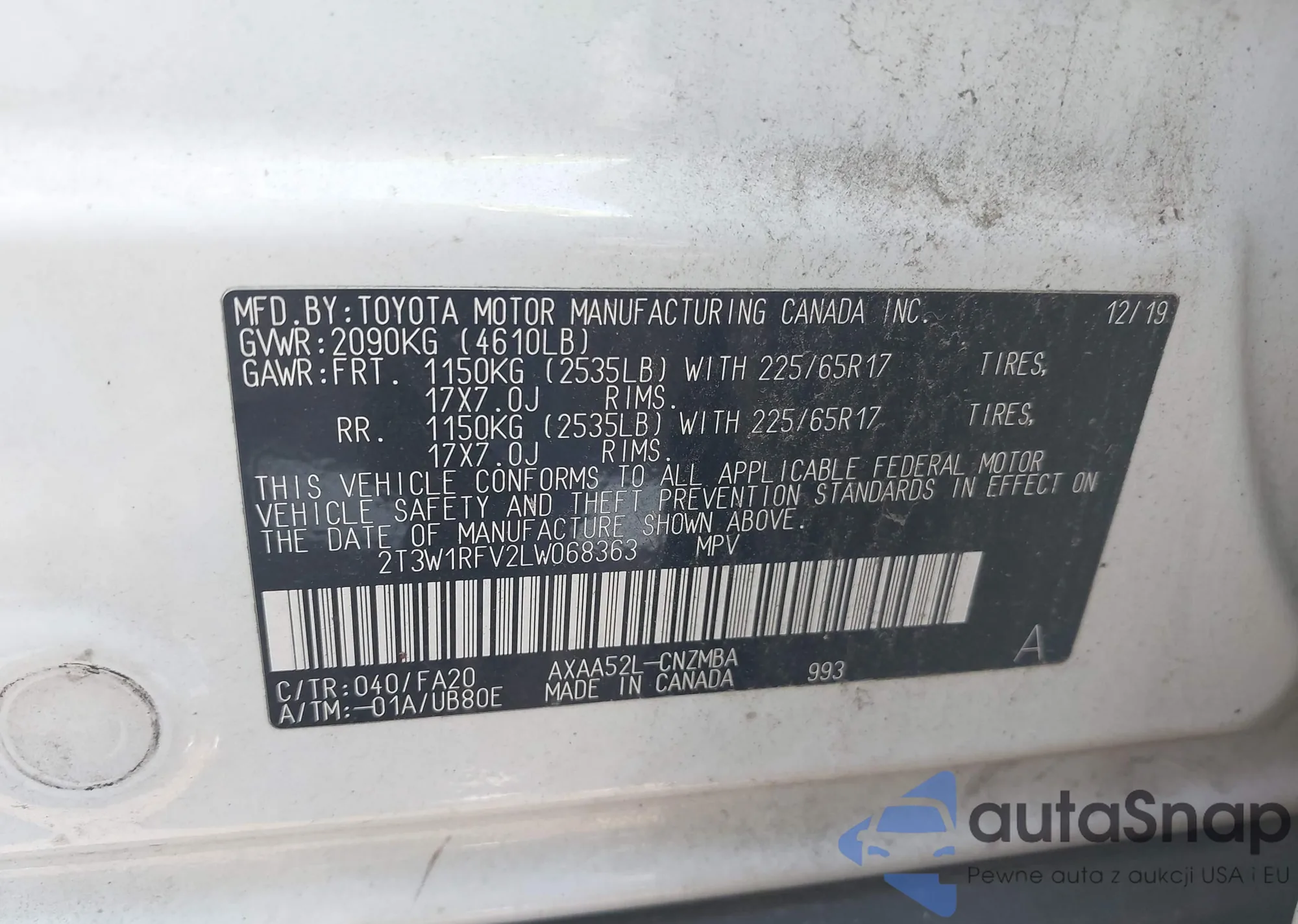 LOT: 42456921 VIN: 2T3W1RFV2LW068363