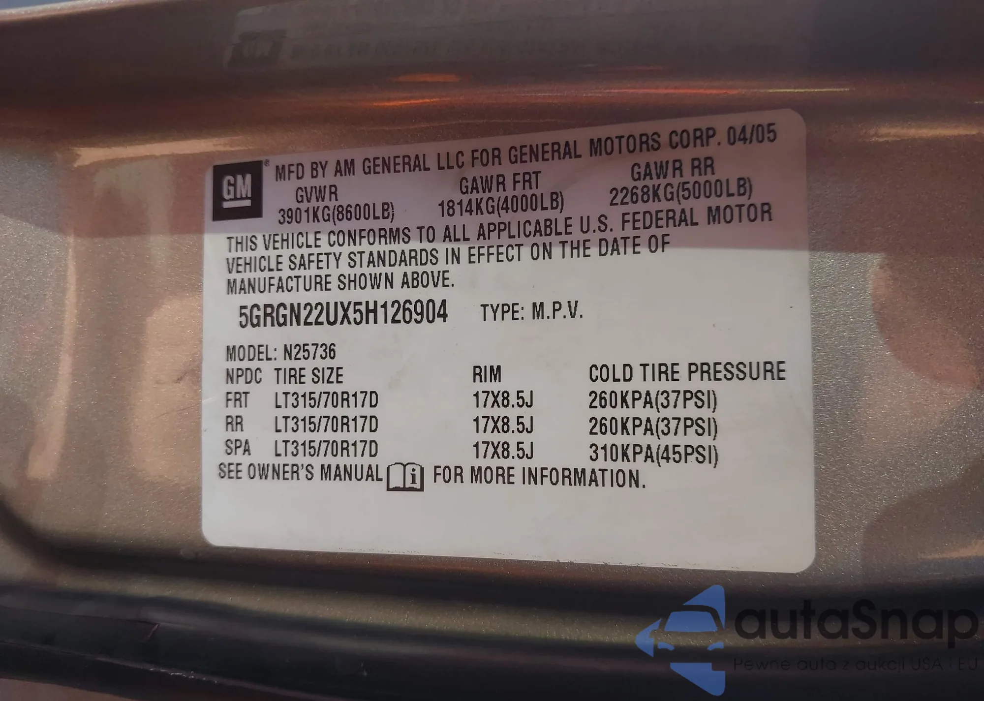 • VIN 5GRGN22UX5H126904