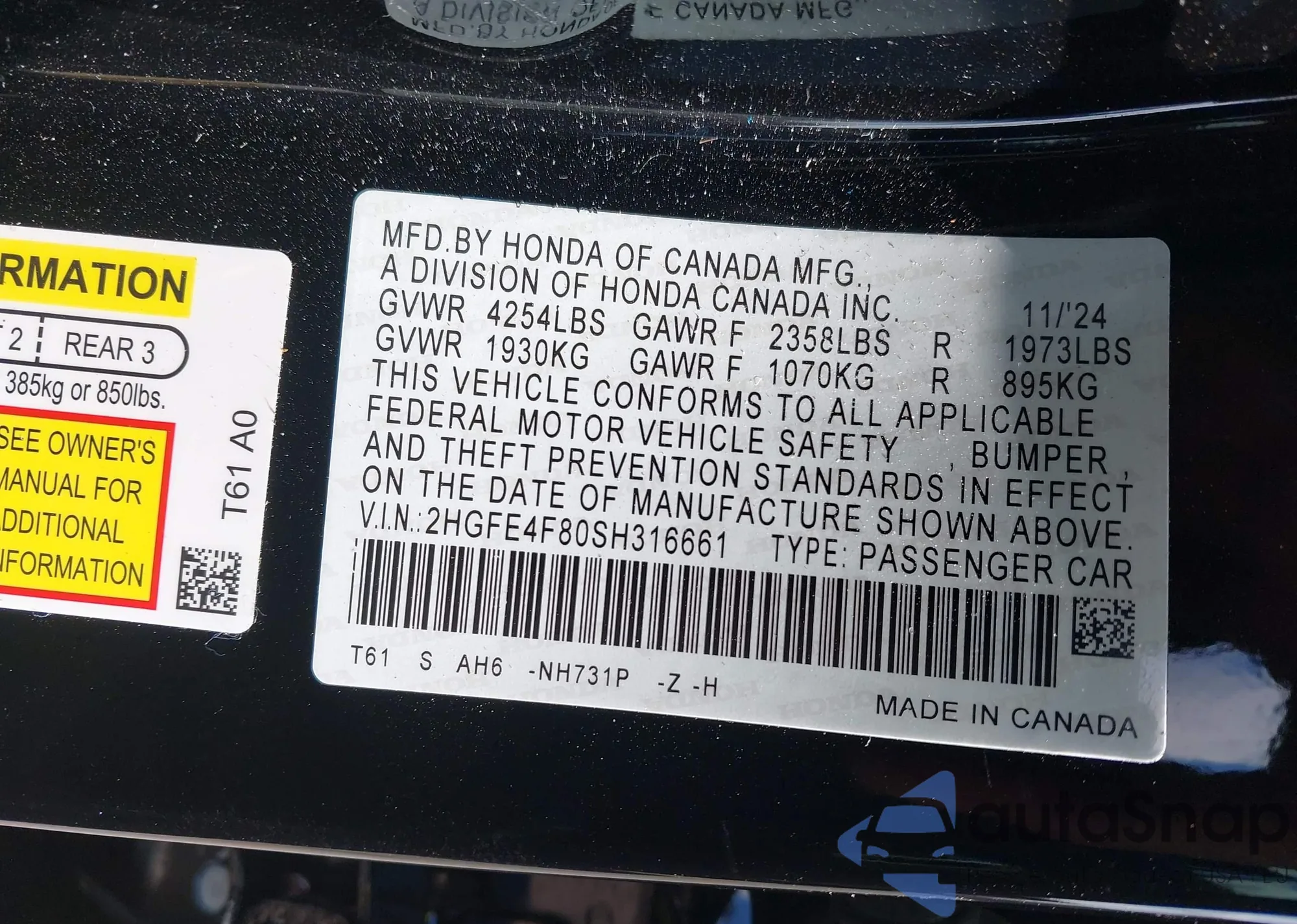 • VIN 2HGFE4F80SH316661