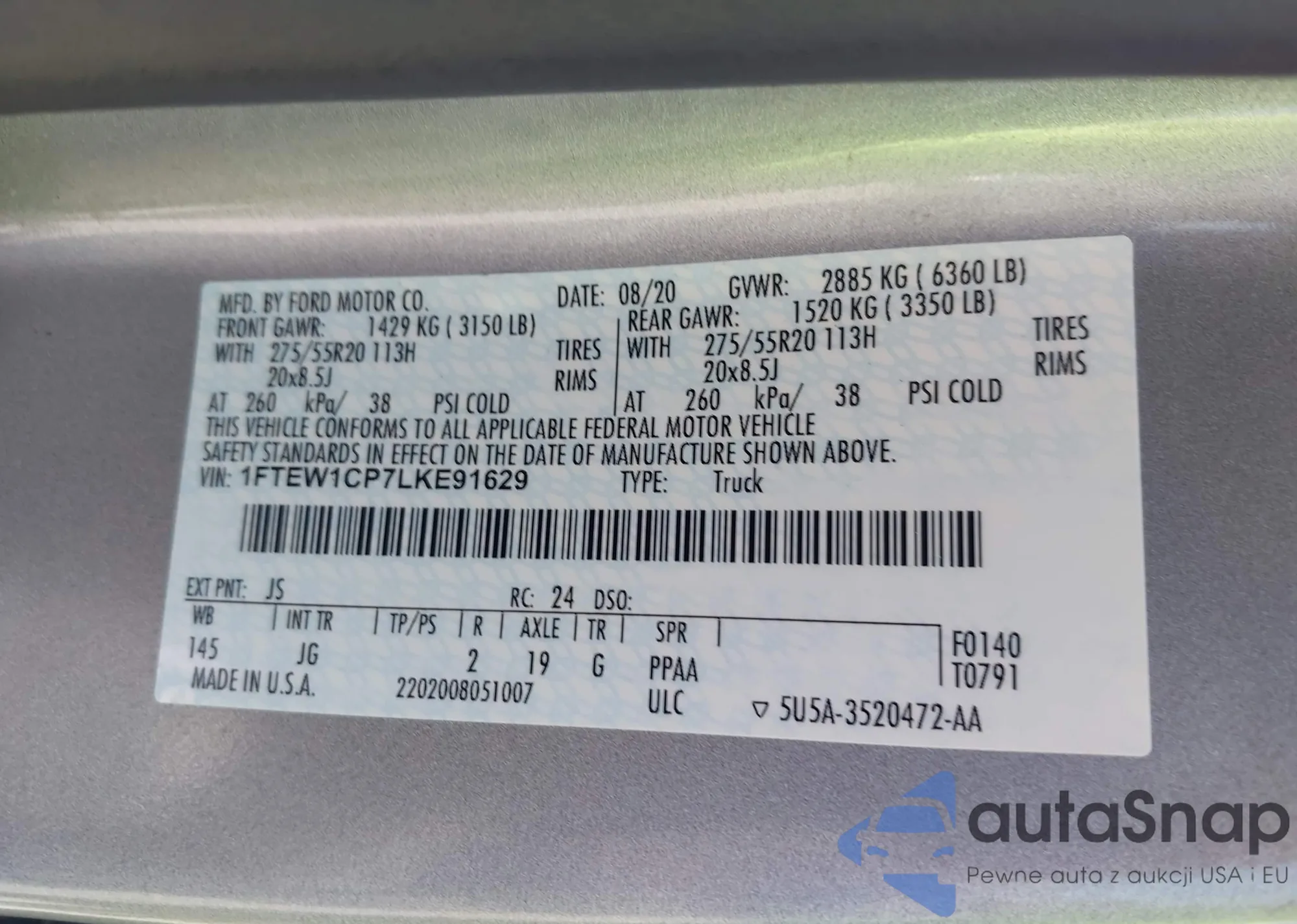 LOT: 42276193 VIN: 1FTEW1CP7LKE91629