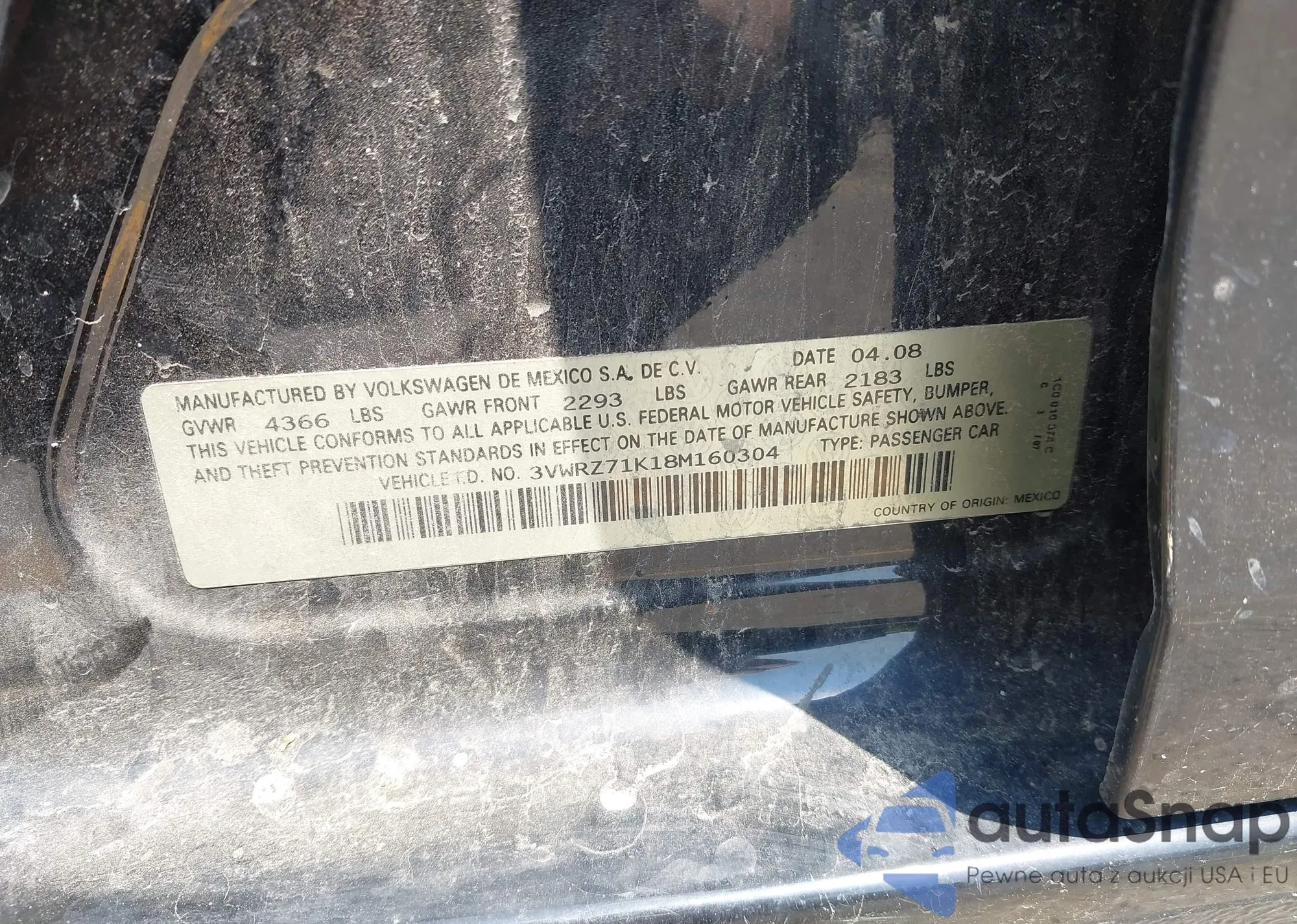 • VIN 3VWRZ71K18M160304