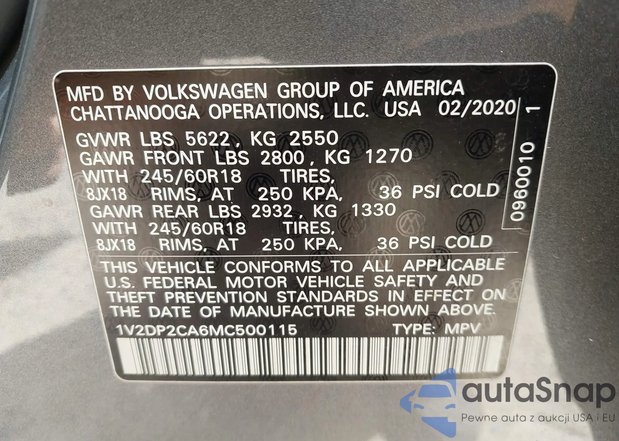 LOT: 42503213 VIN: 1V2DP2CA6MC500115
