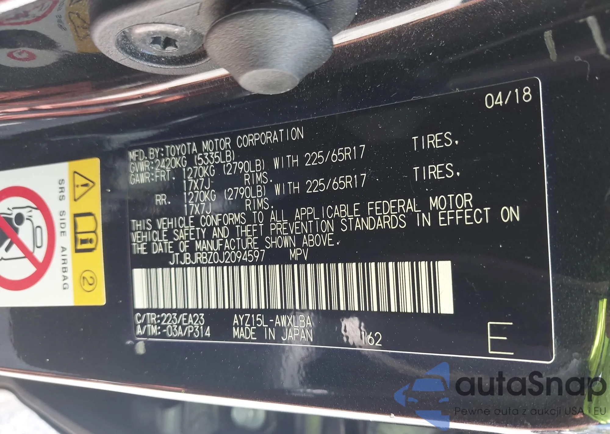 LOT: 42508280 VIN: JTJBJRBZ0J2094597