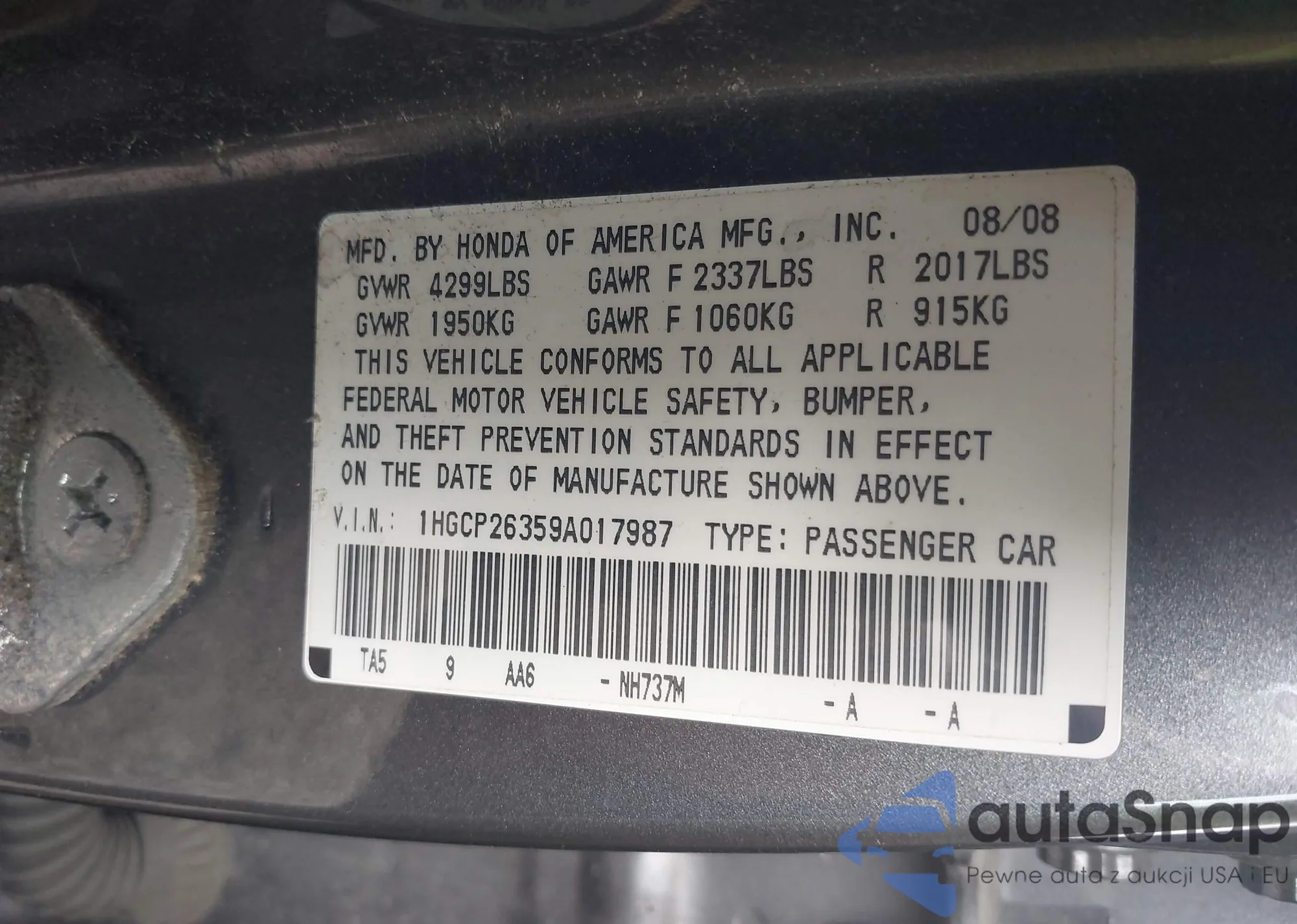 LOT: 42522701 VIN: 1HGCM568X7A172201