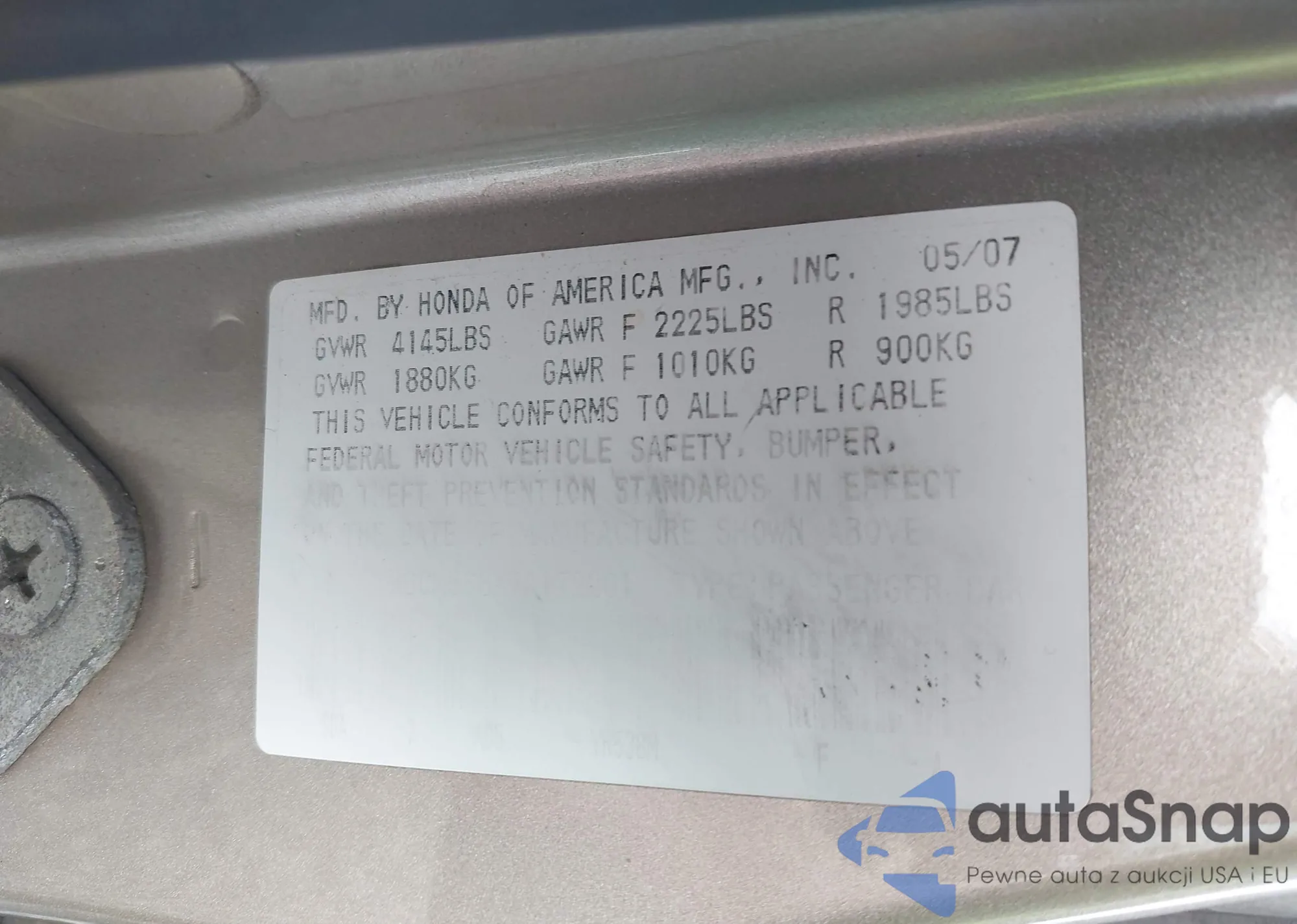 2007 Honda Accord 2.4 Ex z USA, uszkodzony, nr VIN 1HGCM568X7A172201