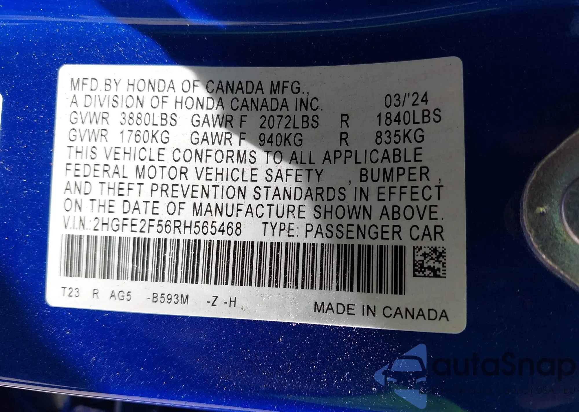 LOT: 42232747 VIN: 2HGFE2F56RH565468