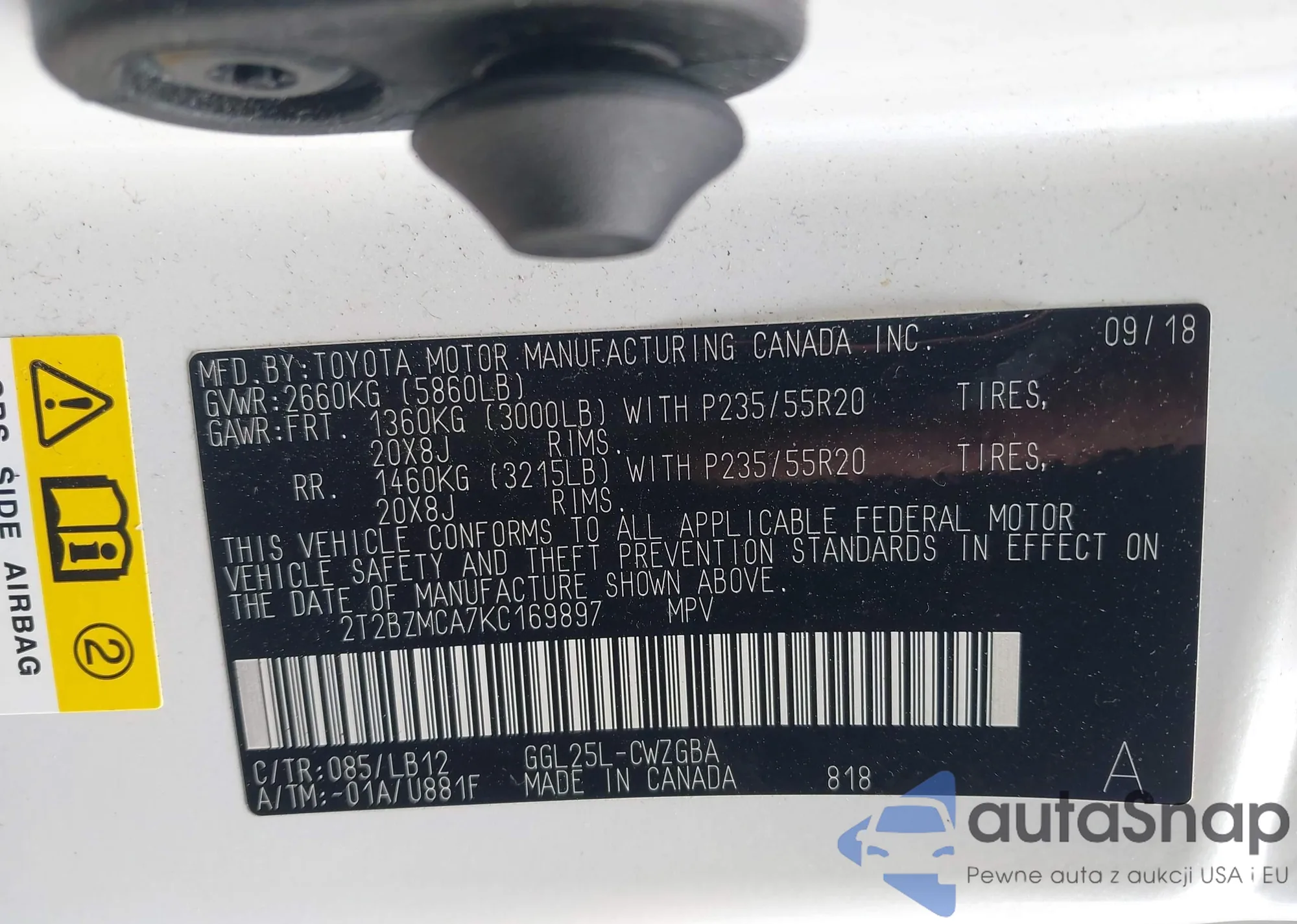 • VIN 2T2BZMCA7KC169897