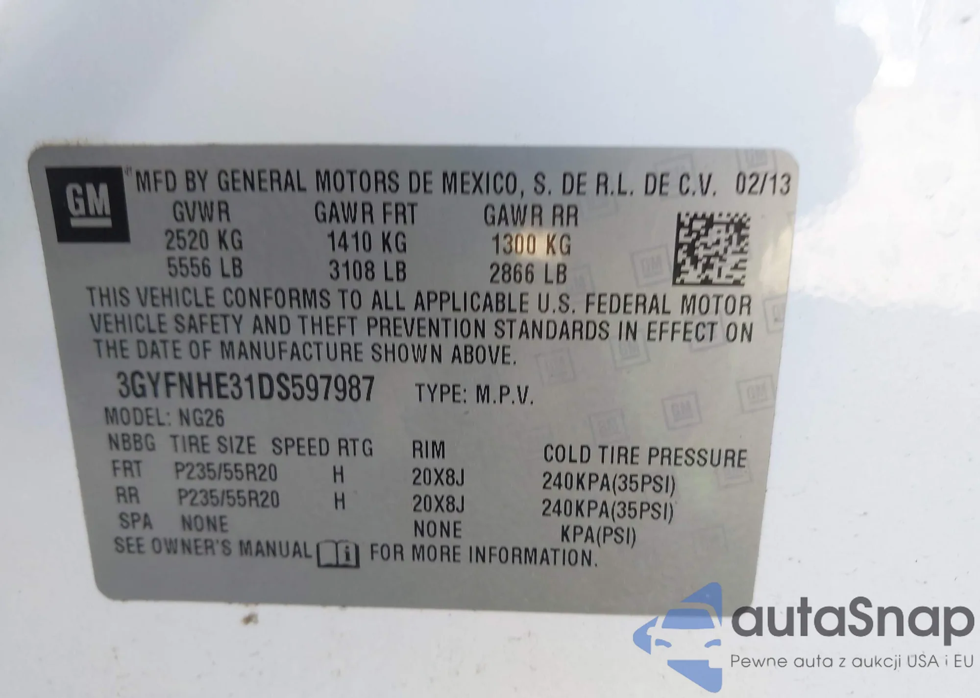 LOT: 42319058 VIN: 3GYFNHE31DS597987