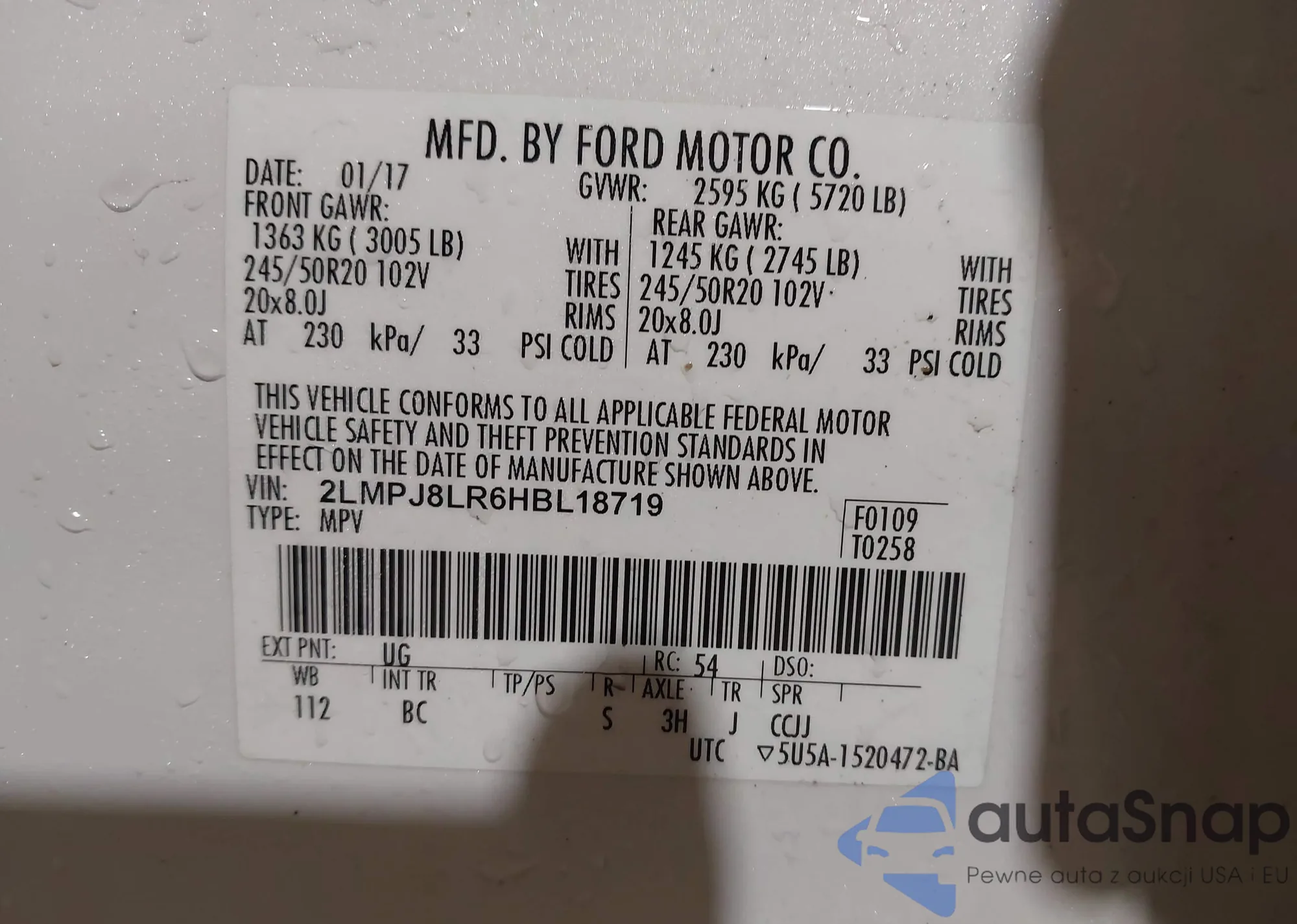 LOT: 41930157 VIN: 2LMPJ8LR6HBL18719