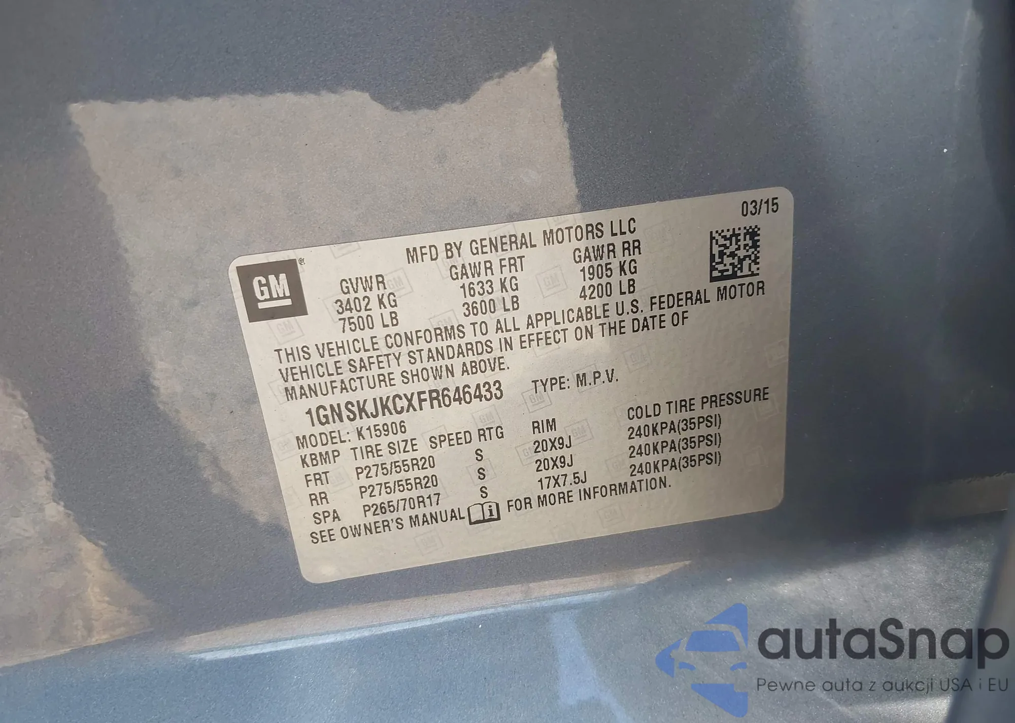 LOT: 42616550 VIN: 1GNSKJKCXFR646433