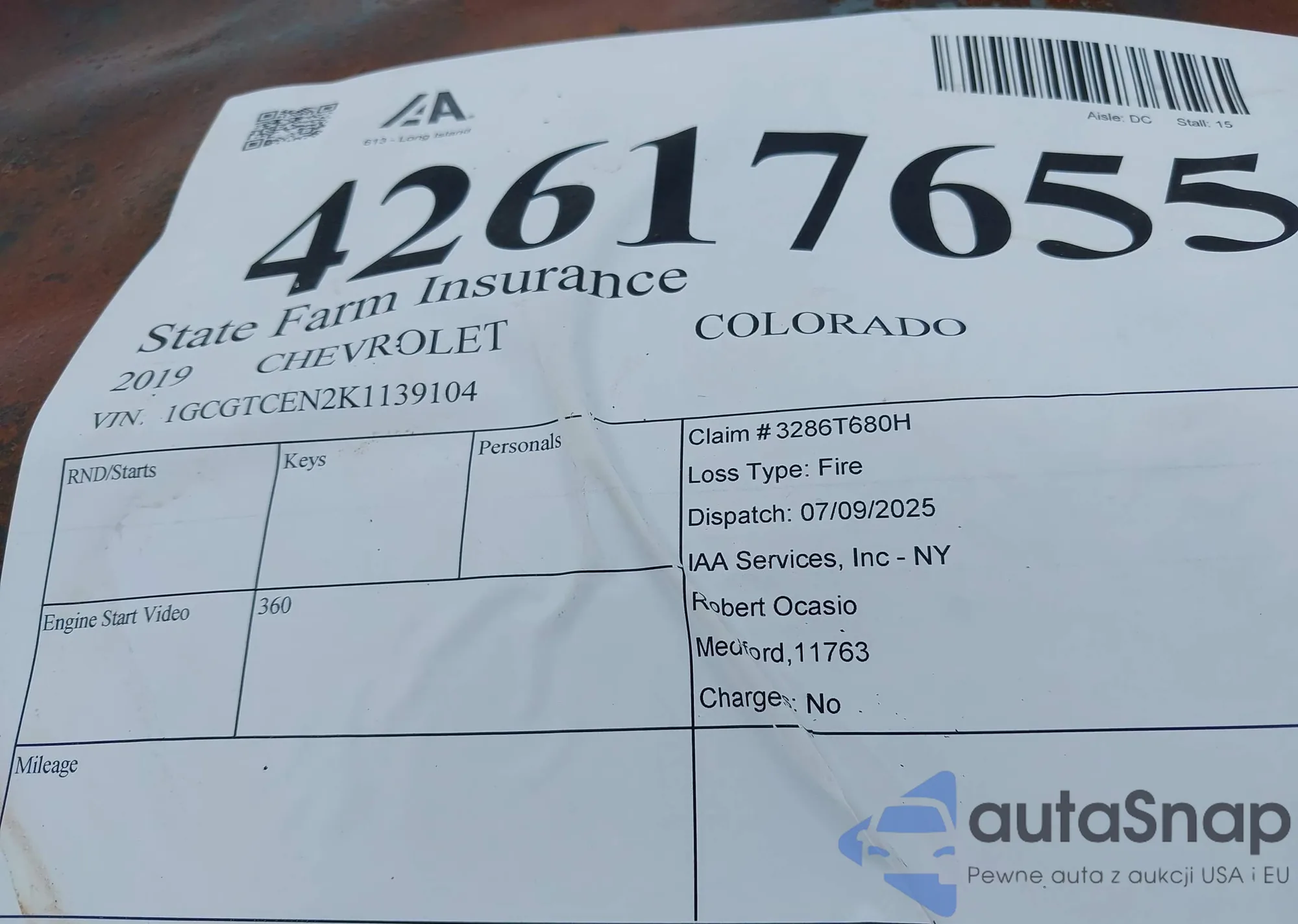 LOT: 42617655 VIN: 1GCGTCEN2K1139104