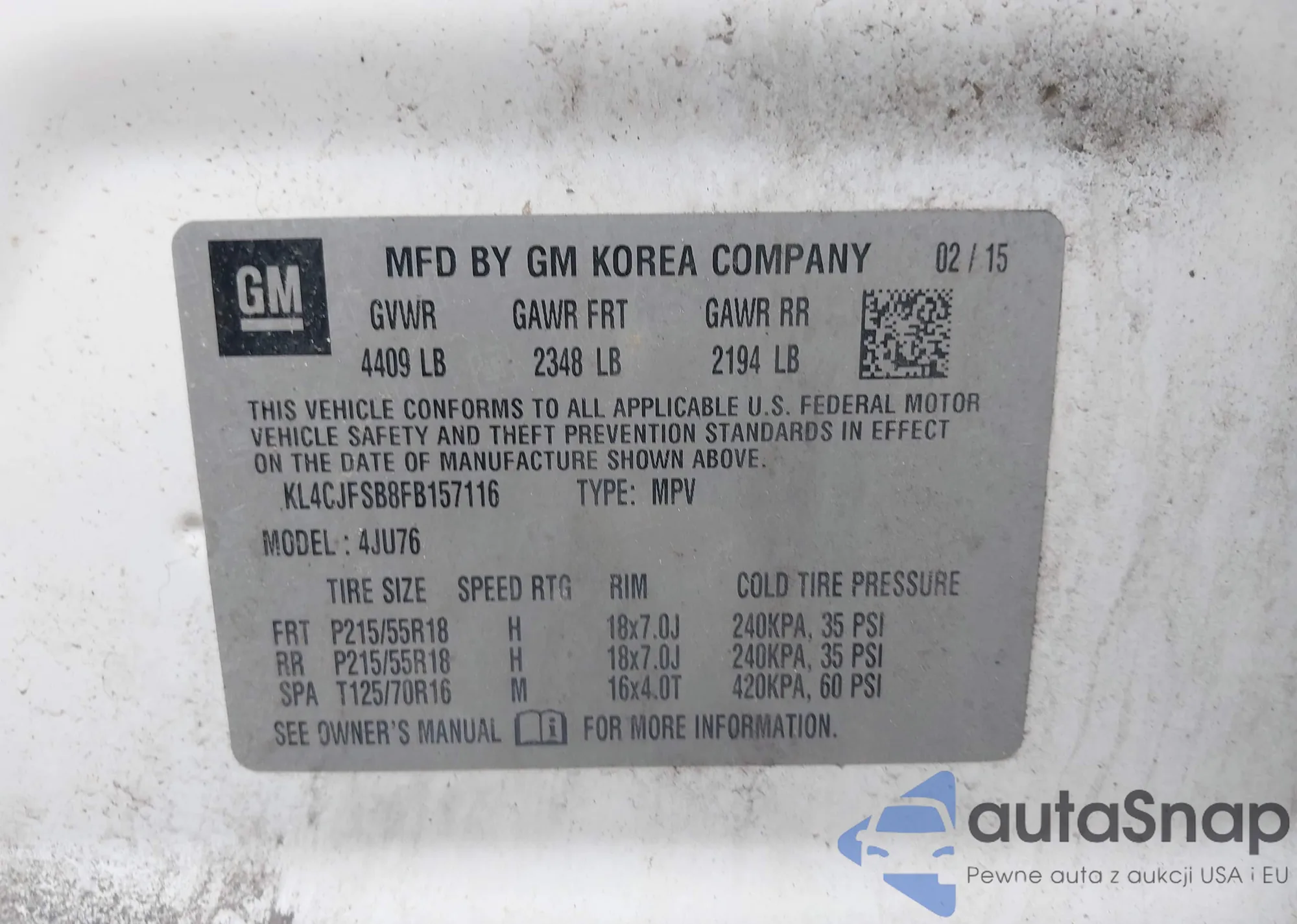 LOT: 42406594 VIN: 5FRYD4H28FB016816