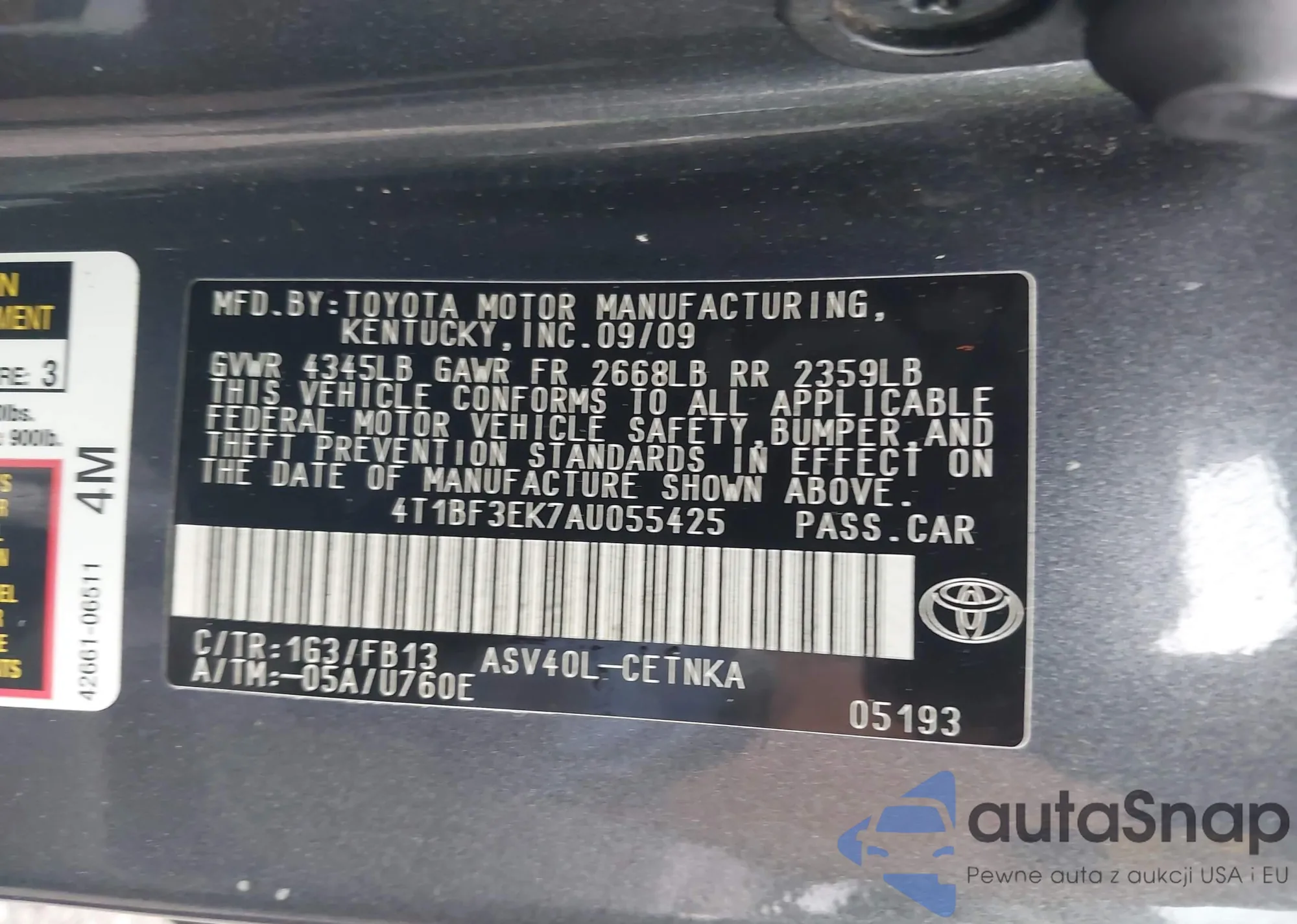 • VIN 4T1BF3EK7AU055425