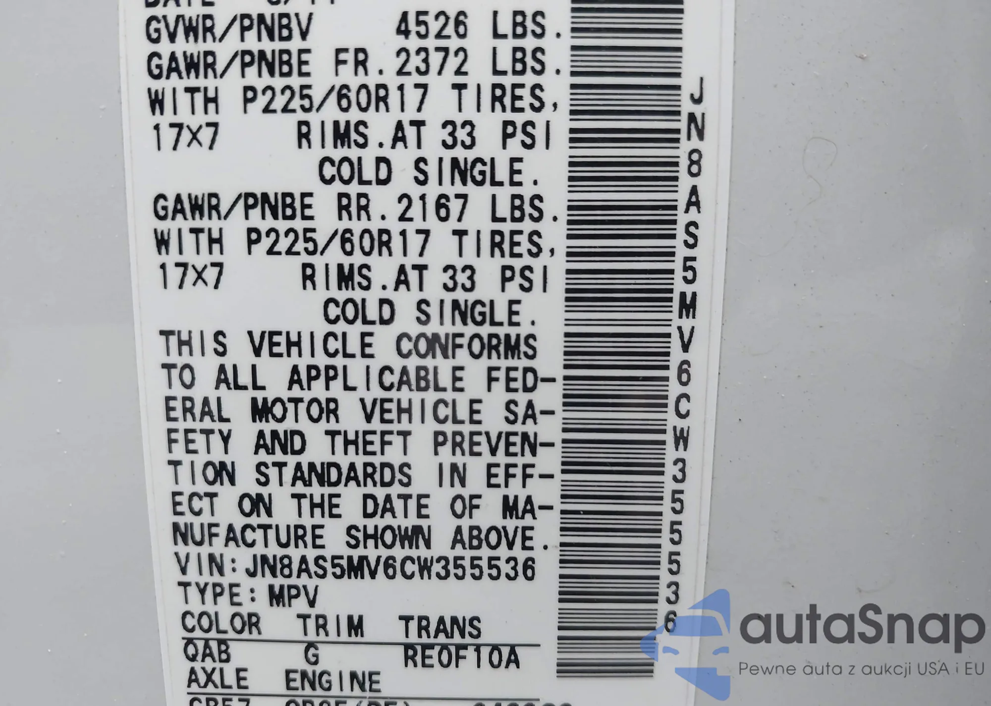 LOT: 42169876 VIN: JN8AS5MV6CW355536
