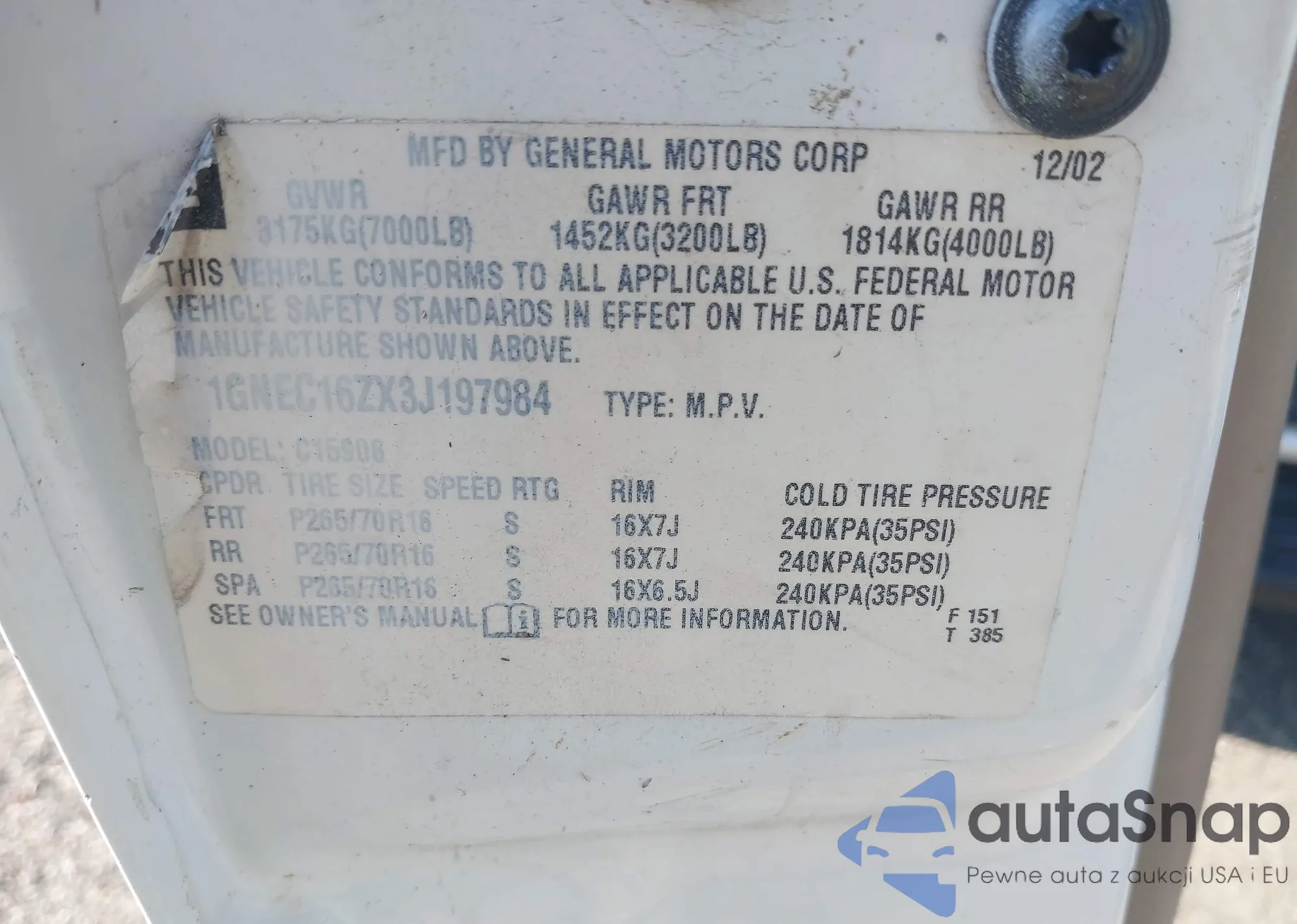 • VIN 1GNEC16ZX3J197984