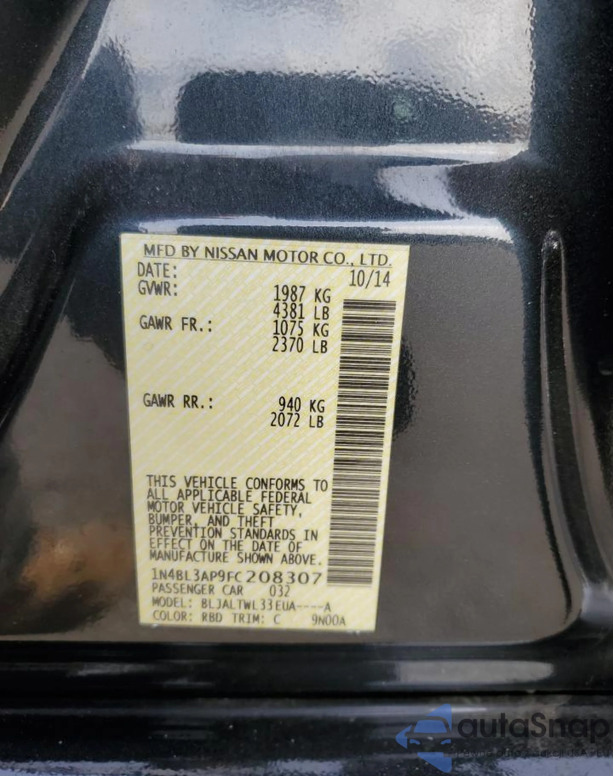 • VIN 1N4BL3AP9FC208307
