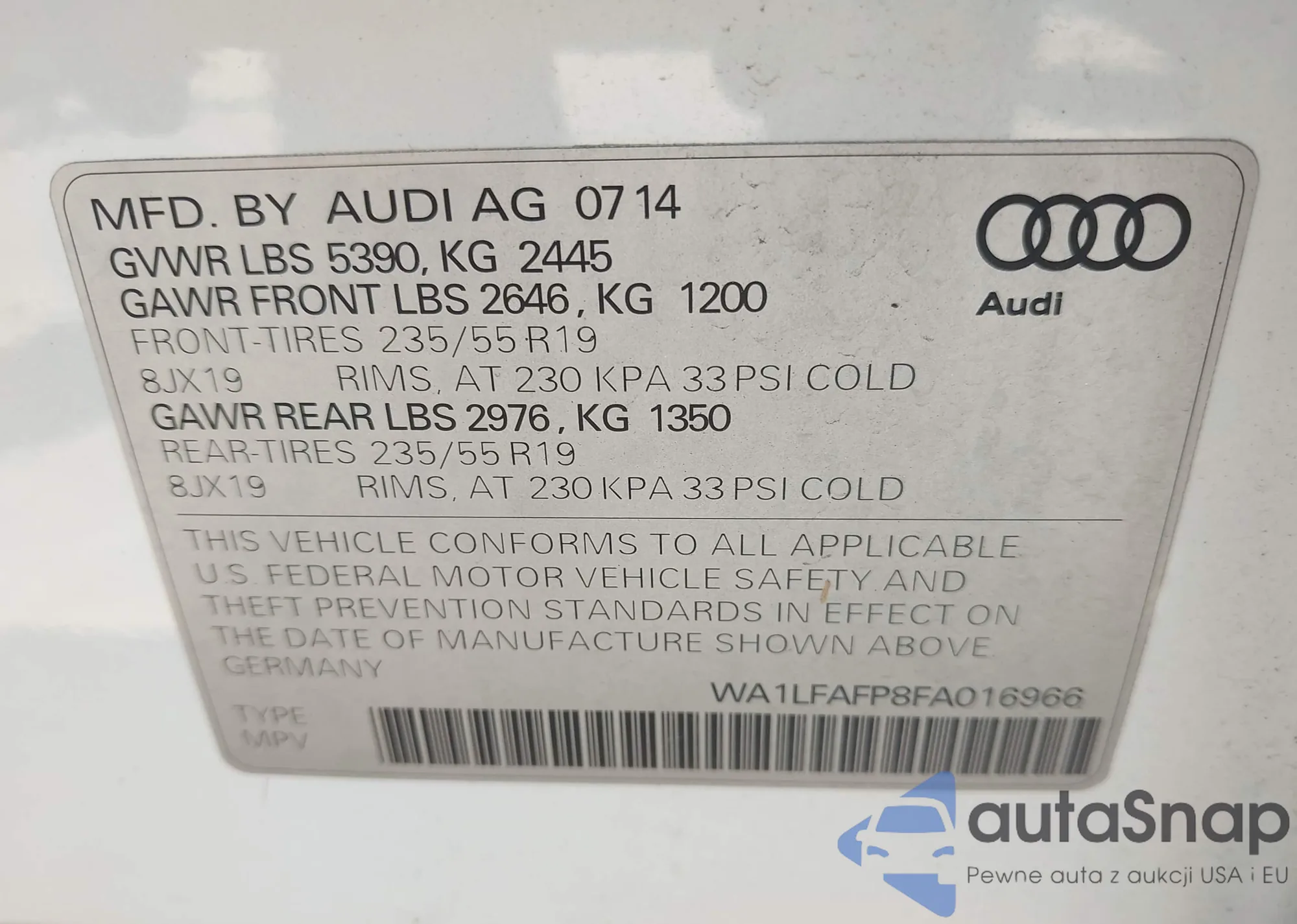 LOT: 42215818 VIN: WA1EECF38N1139153