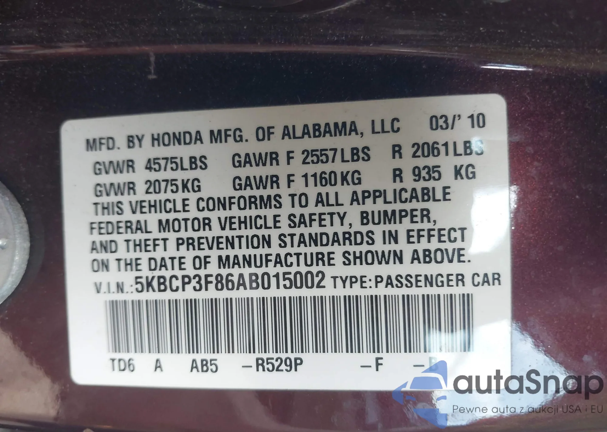 • VIN 2HGFA1F58BH532466