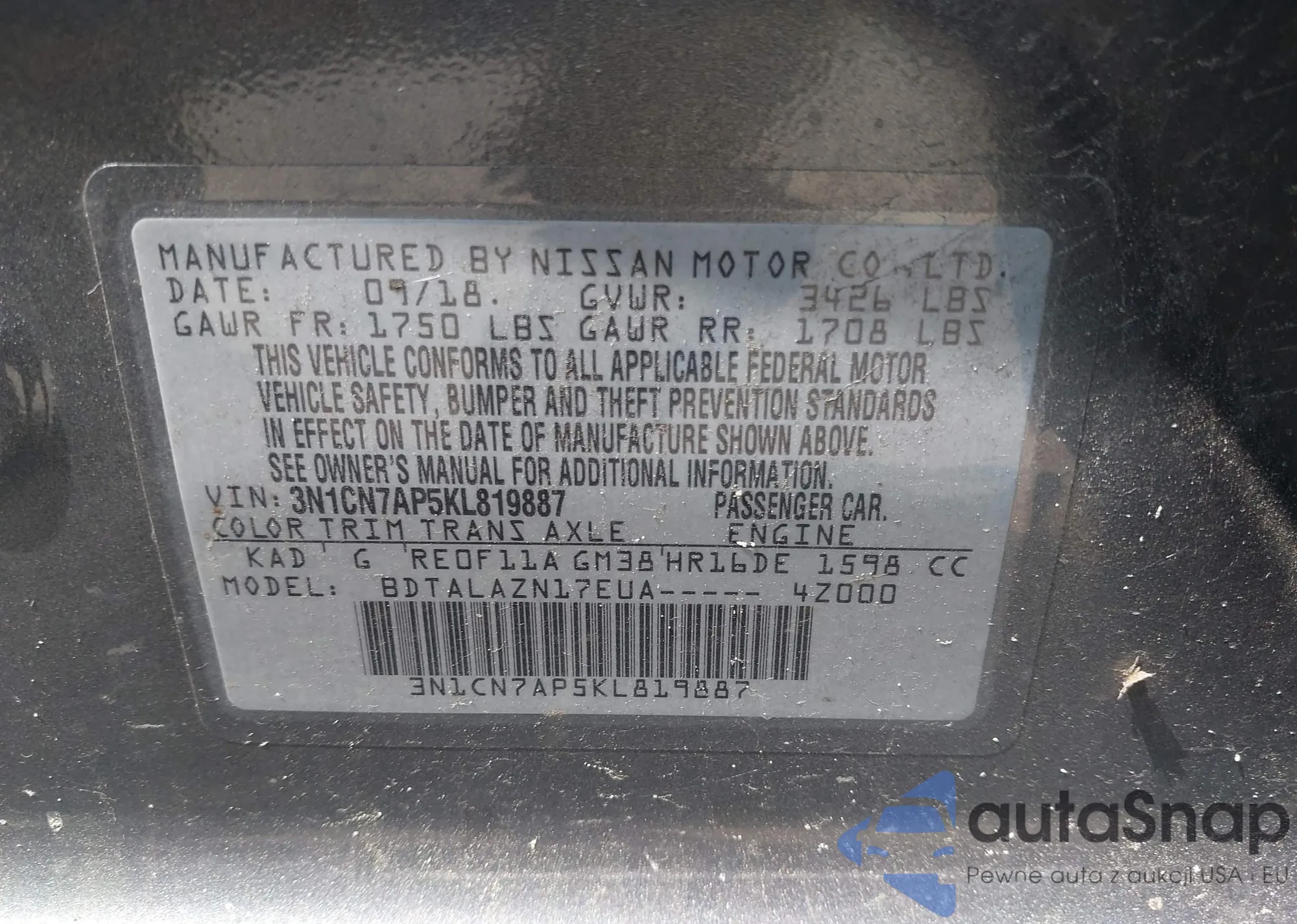 • VIN 3N1CN7AP5KL819887