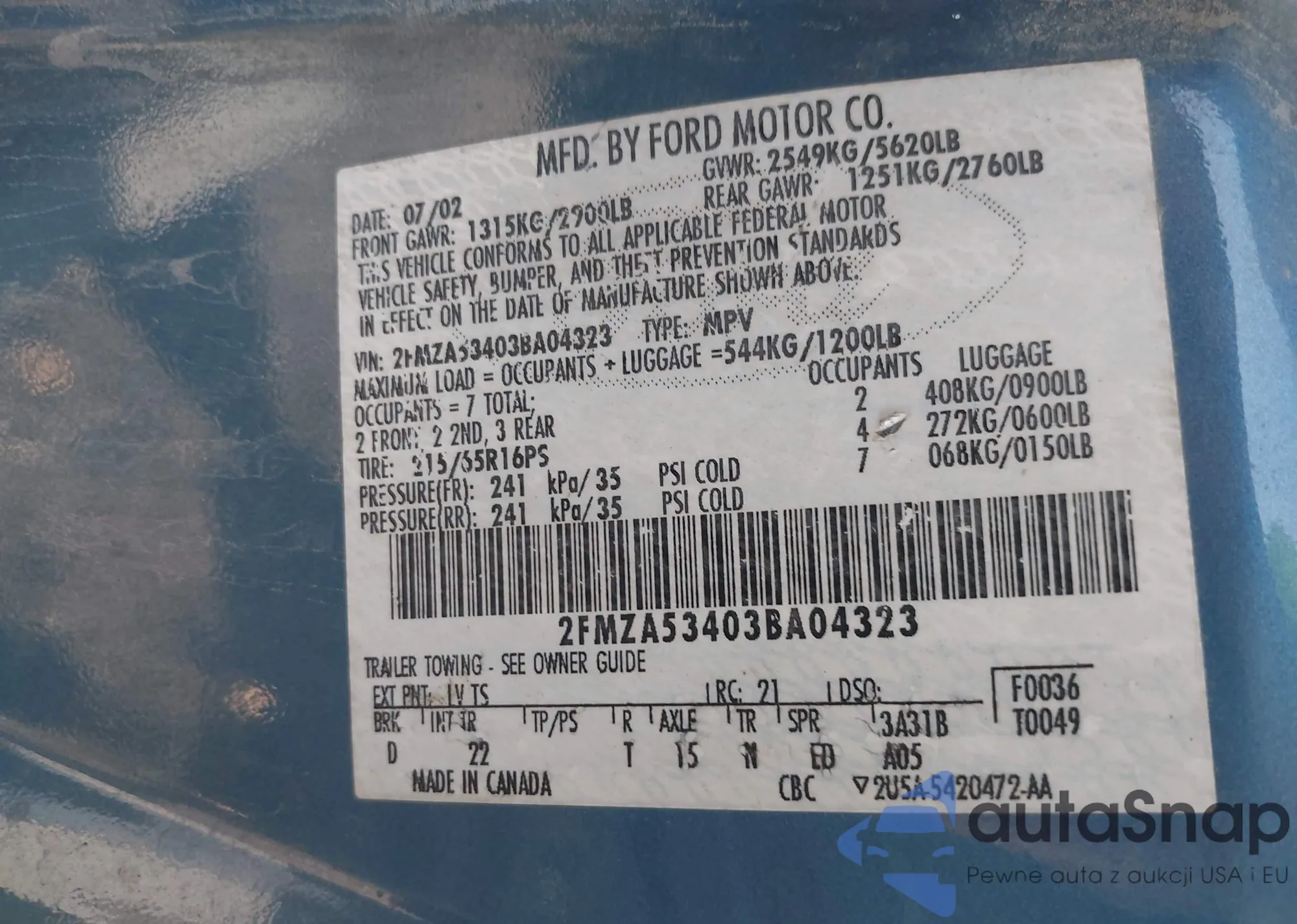 • VIN 2FMZA53403BA04323
