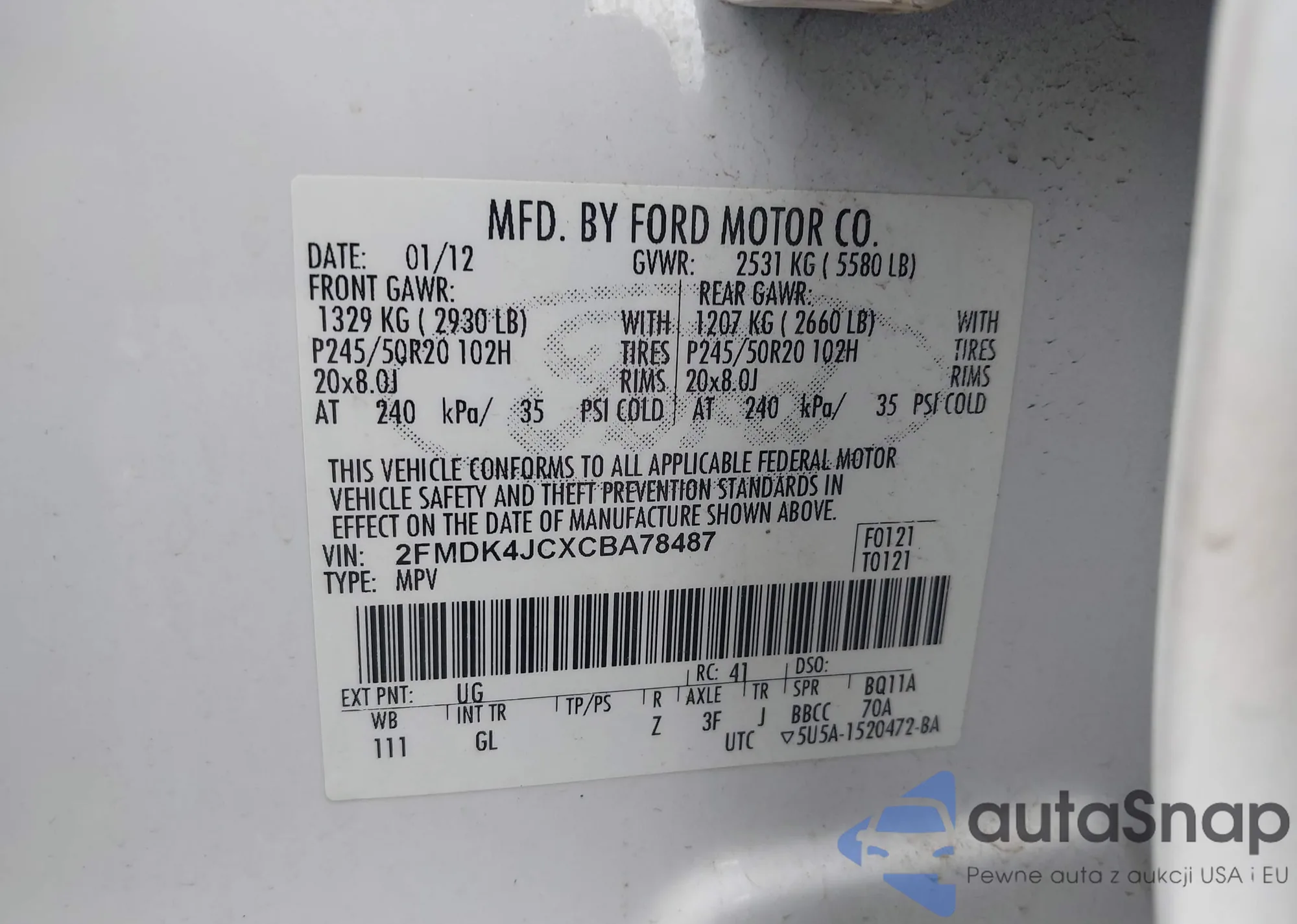 LOT: 42311348 VIN: 2FMDK4JCXCBA78487