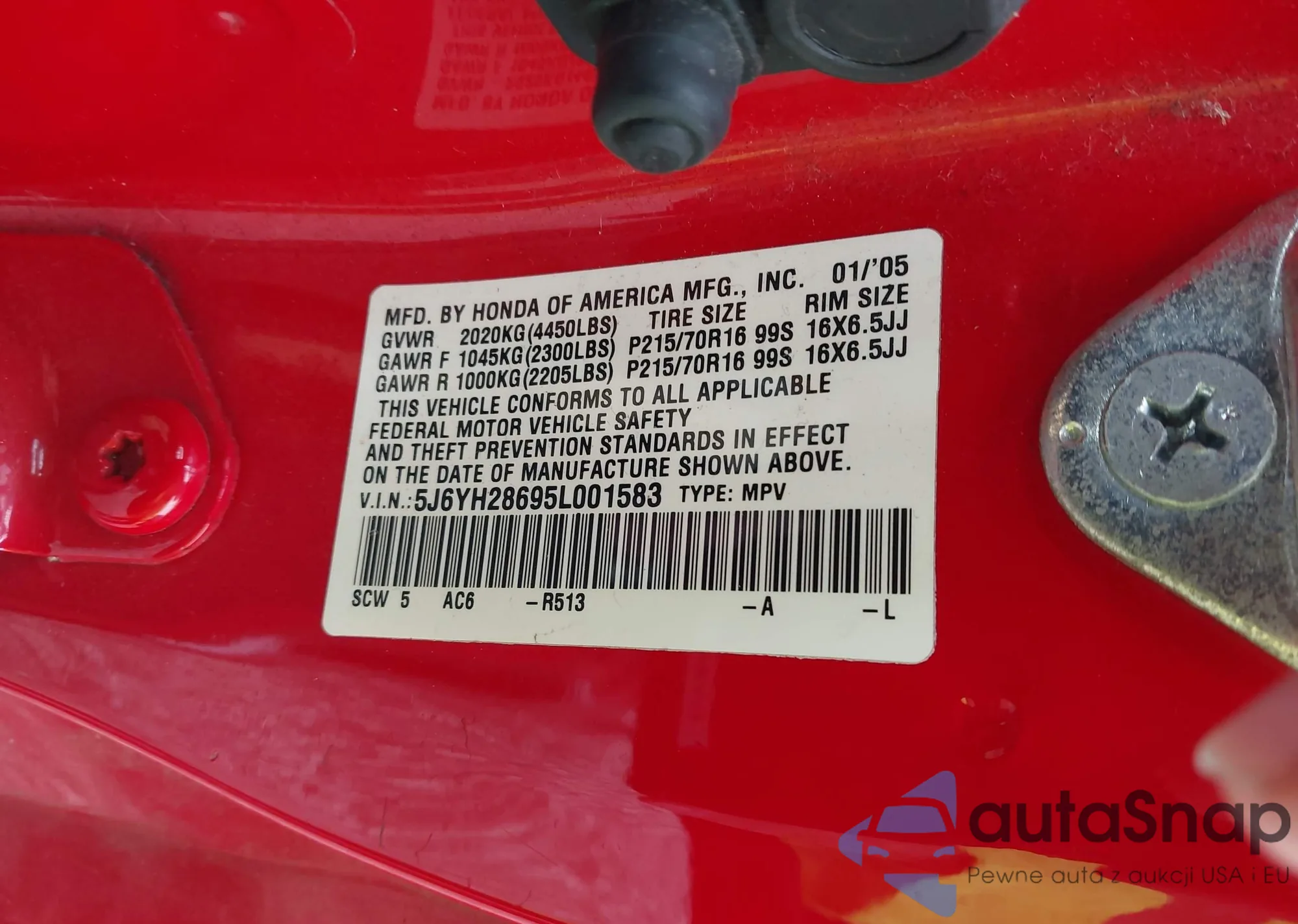 LOT: 42309089 VIN: 5J6YH28695L001583