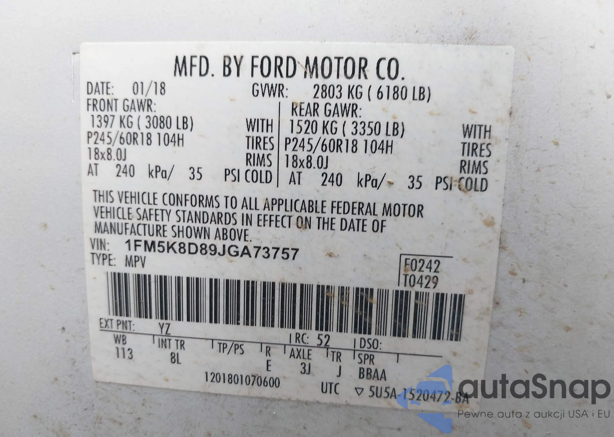 LOT: 42330813 VIN: 1FM5K8D89JGA73757