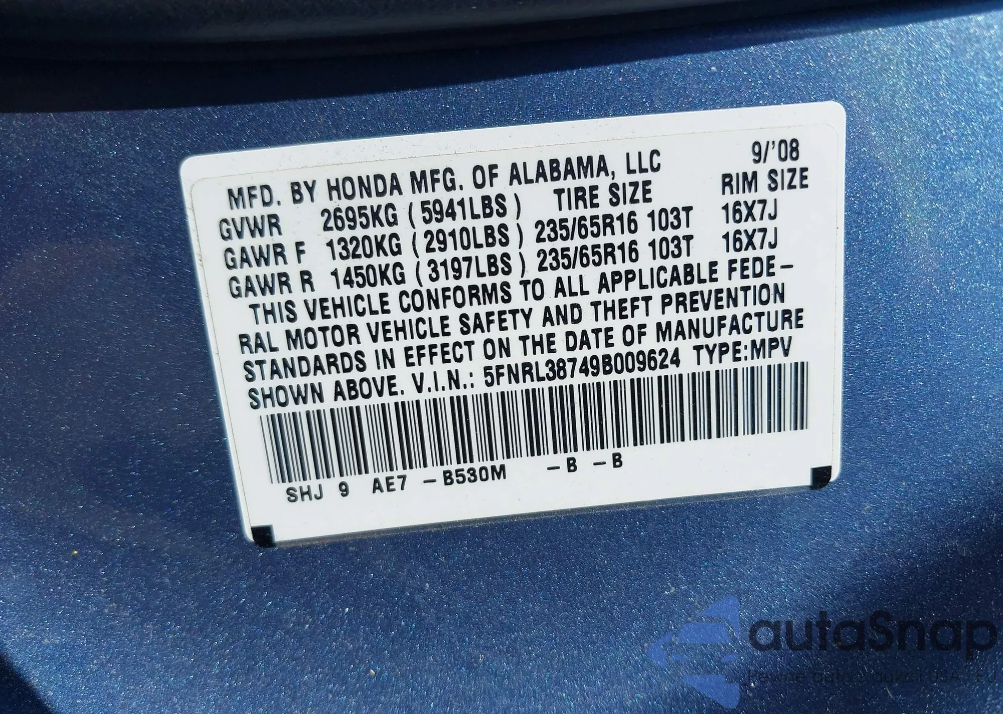 • VIN 1HGCY2F87PA039060