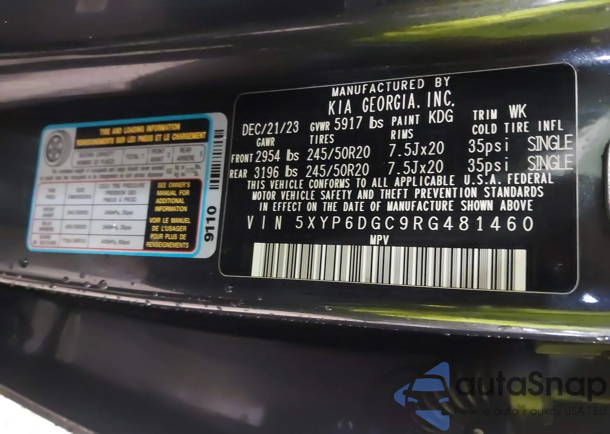 LOT: 42309411 VIN: 5XYP6DGC9RG481460