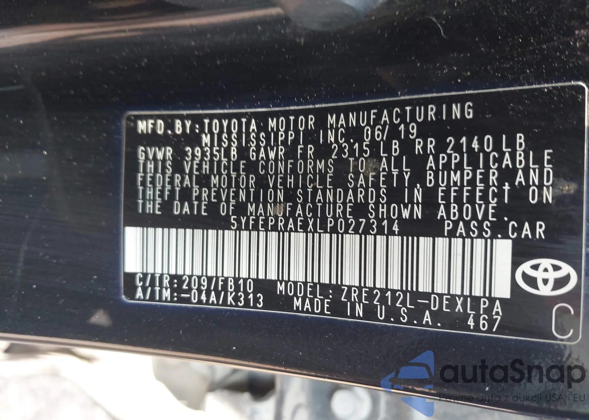LOT: 42411912 VIN: 5YFEPRAEXLP027314