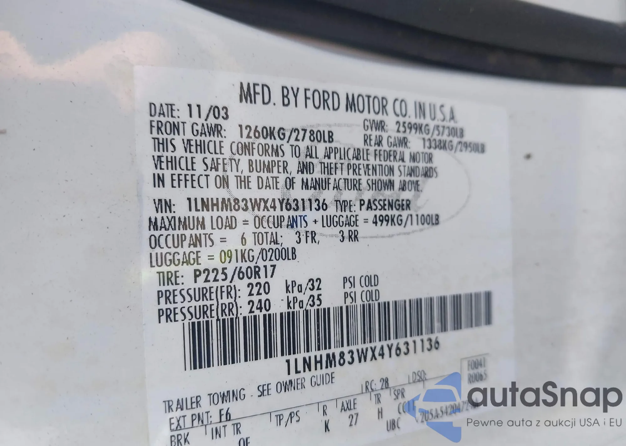 • VIN 1LNHM83WX4Y631136