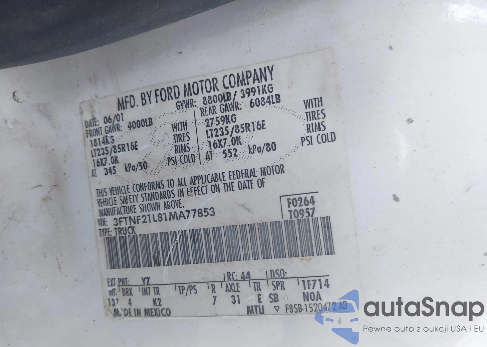 LOT: 42409790 VIN: 3FTNF21L81MA77853