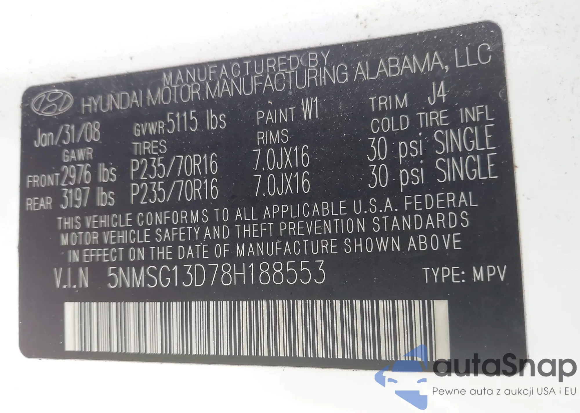 LOT: 42461008 VIN: 5NMSG13D78H188553