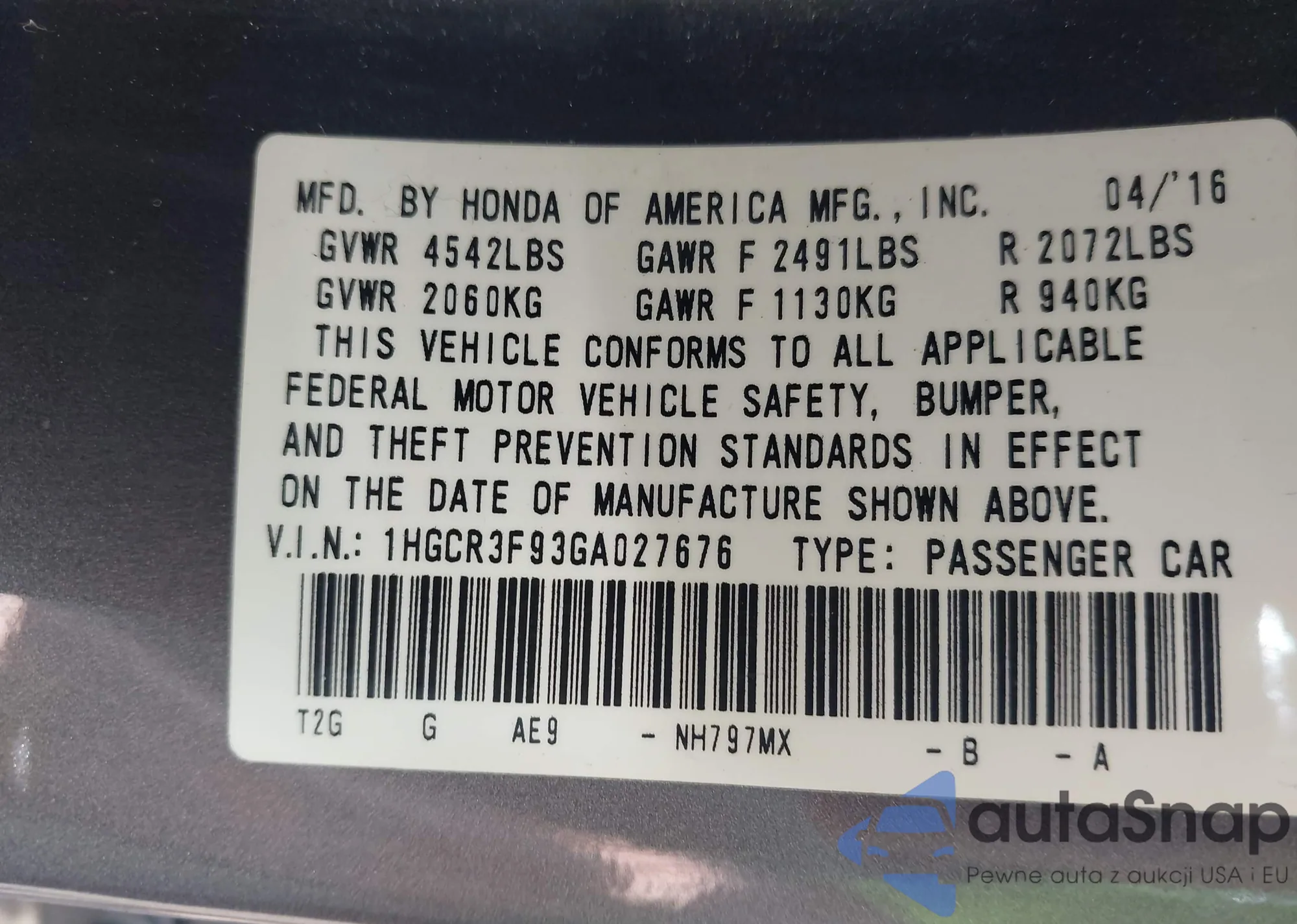 LOT: 42426746 VIN: 1HGCR3F93GA027676